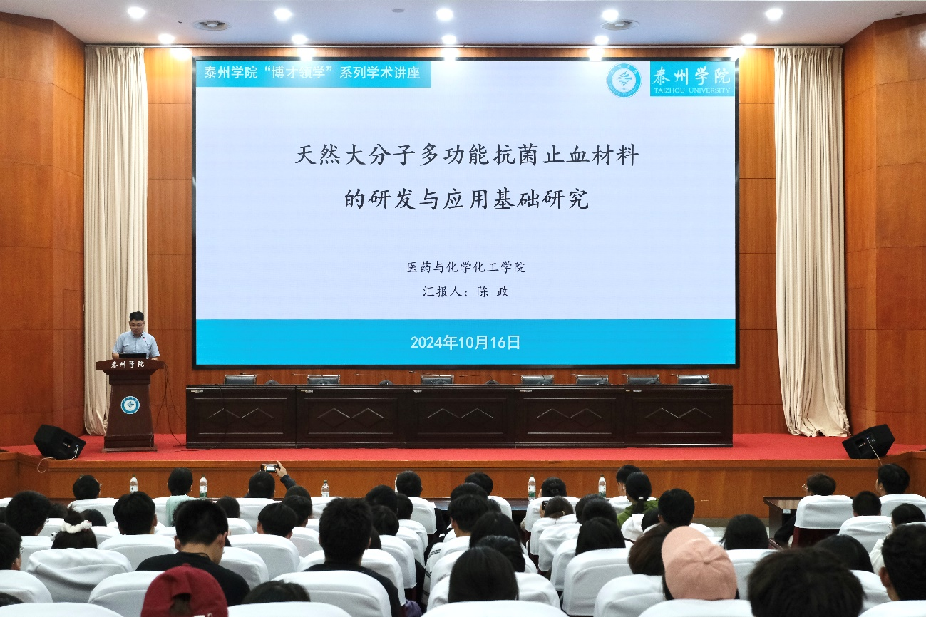 启动仪式后,第一期学术讲座由今年获得国家自然科学基金青年项目的季鹏博士、新引进高层次人才陈政博士主讲。两位博士分别就《TfR1介导的去铁蛋白递药系统的构建及其靶向治疗乳腺癌的研究》和《天然大分子多功能抗菌止血材料的研发与应用基础研究》介绍了项目研究思路、进展及阶段性成果,既深入浅出,又幽默风趣,赢得了现场师生的阵阵掌声。