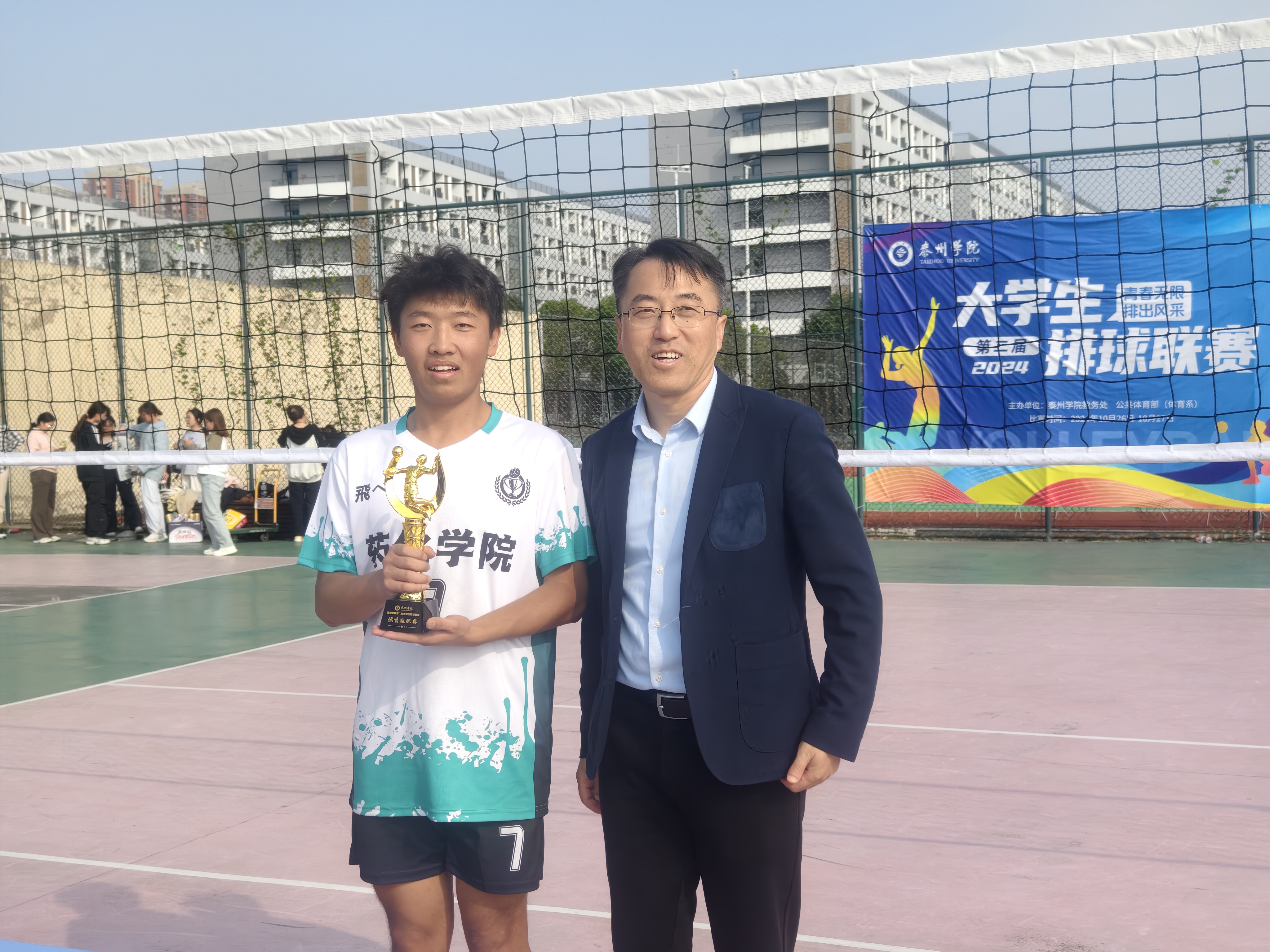 赛后,闭幕式在排球场举行。学工处处长陈茂国、教务处处长黄华、公共体育部主任赵益鑫以及公体部部分教师参加了闭幕式。陈茂国为获奖队伍颁发奖杯与证书。黄华对所有参赛队伍表示祝贺,对裁判员、工作人员及志愿者的辛勤付出表示感谢,他强调,本次联赛不仅是一次体育竞技的盛会,更是展现泰院学子团结协作、勇于拼搏精神的重要平台。赵益鑫鼓励同学们继续发扬体育精神,积极参与各类体育活动,锻炼身体,增强体质,为推动校园体育文化建设贡献自己的力量。