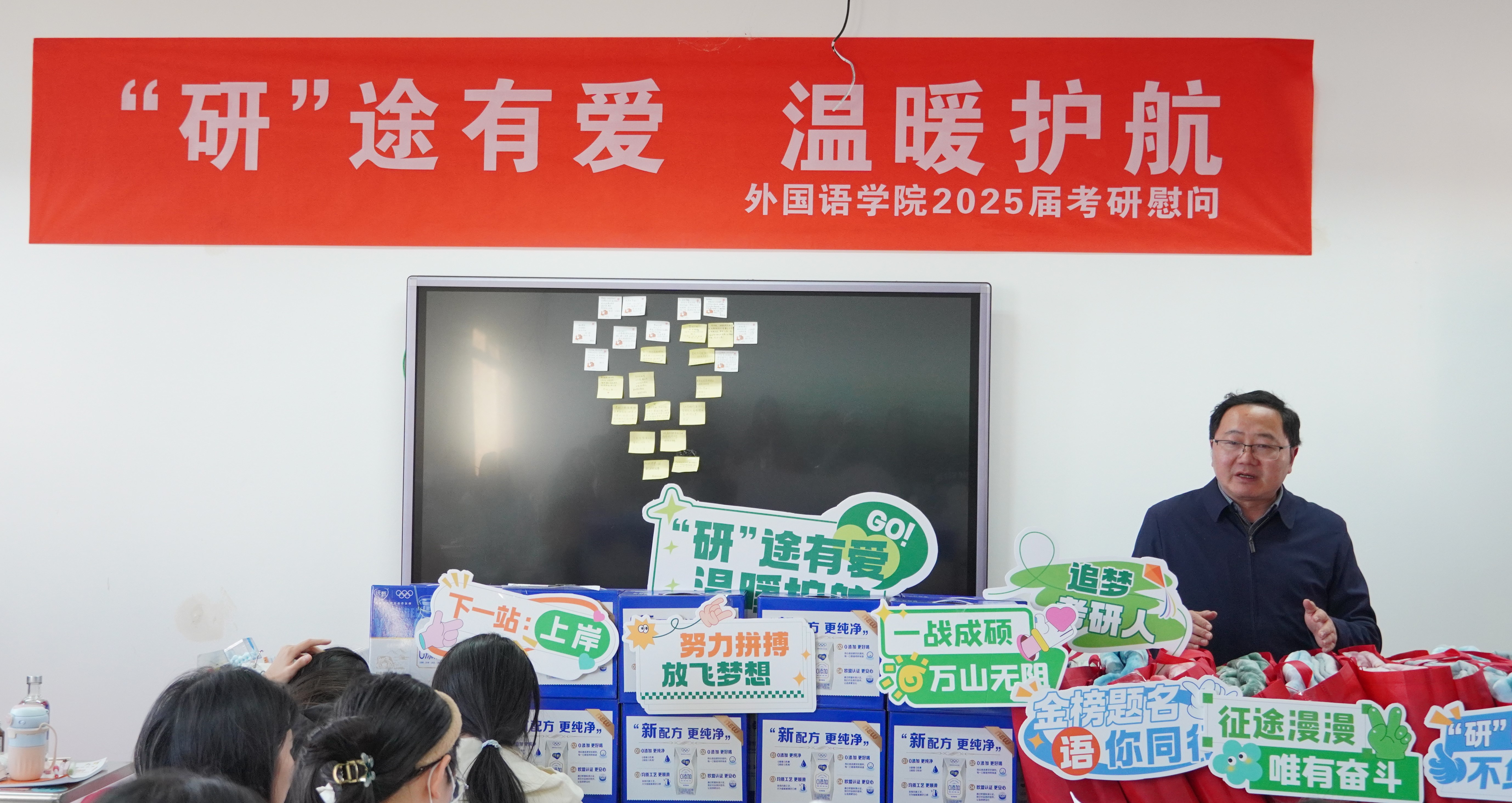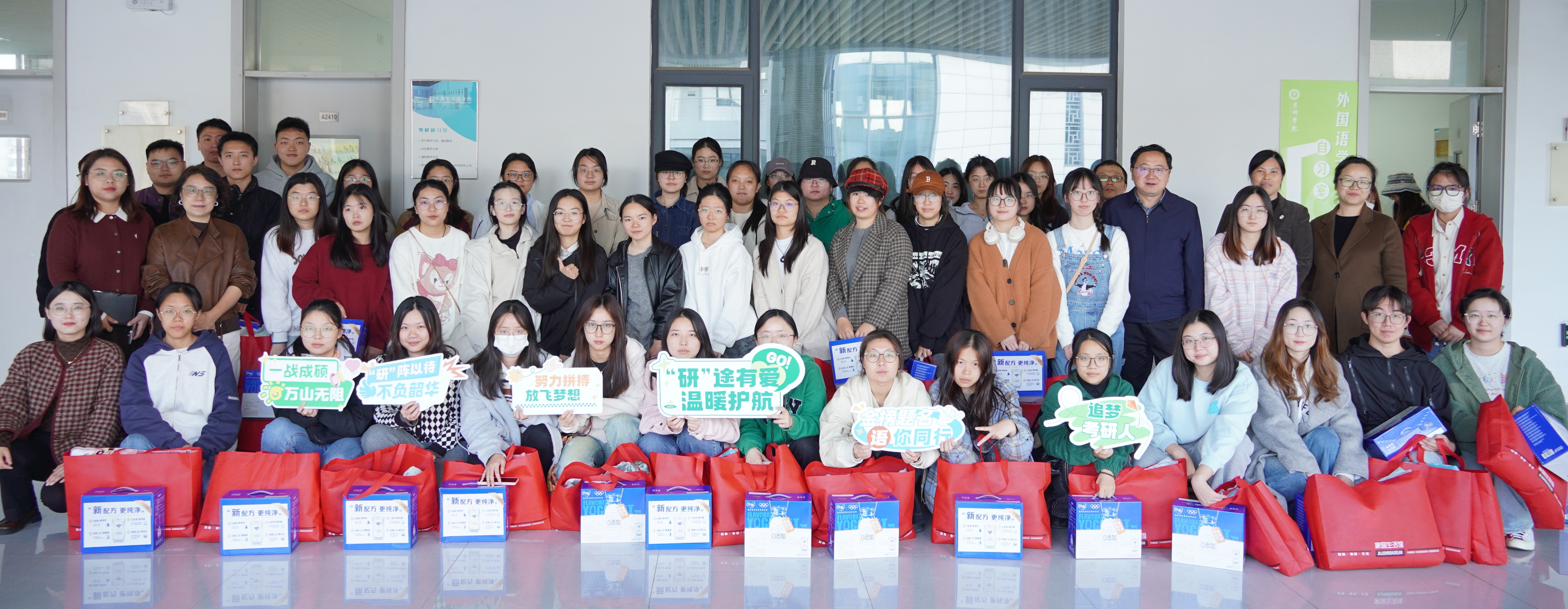 活动中,学院领导和老师为考研学生赠送了充满关爱和祝福的加油礼包,为学生带去温暖,提振士气。