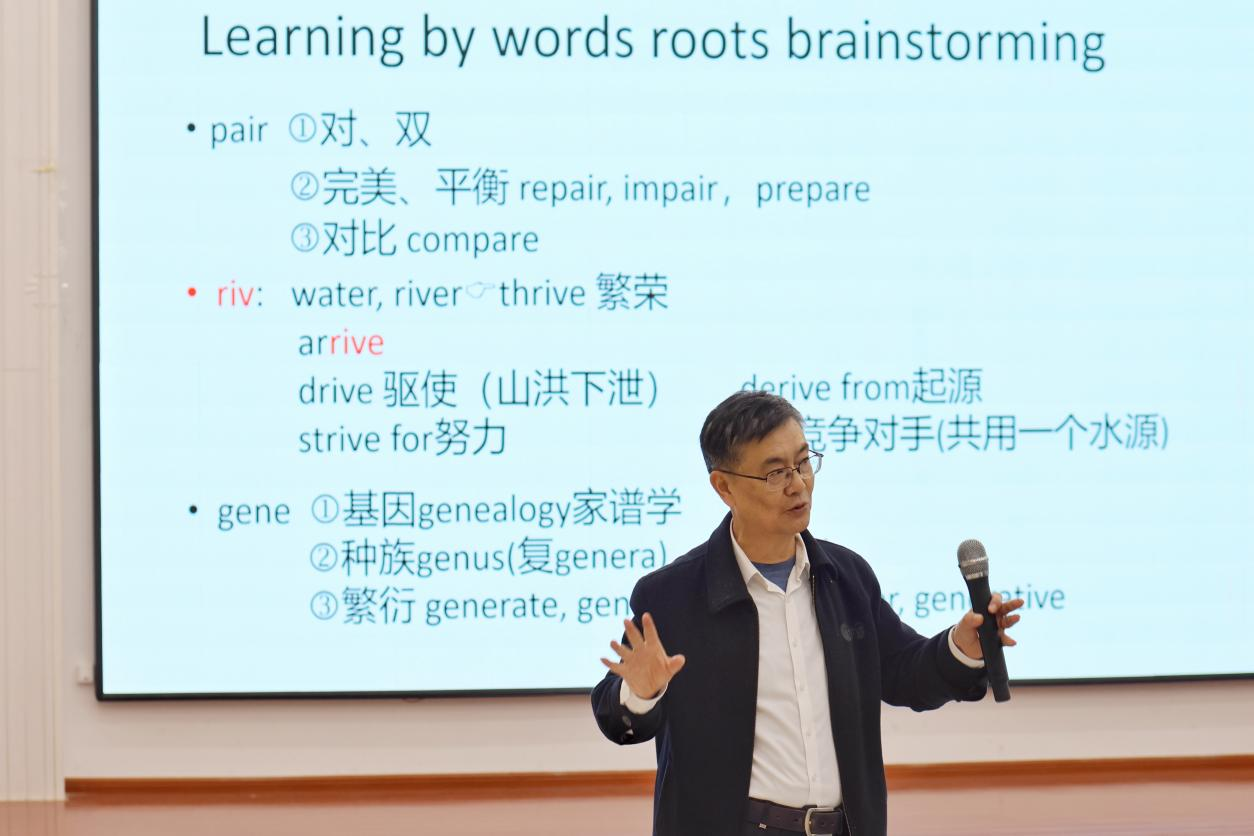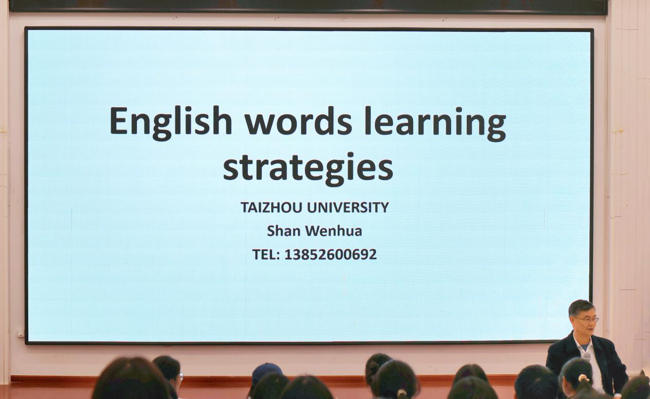 讲座中,单文华以“英语语言学习策略探究”为题,深入浅出地从英语语言学习策略的研究背景、研究意义、学习策略及其在英语学习中的应用四个方面展开授课。他结合实例,分析英语词根、词缀、词源对英语单词记忆的重要作用,既具有理论深度,又贴近实际应用,赢得了学生们的阵阵掌声。