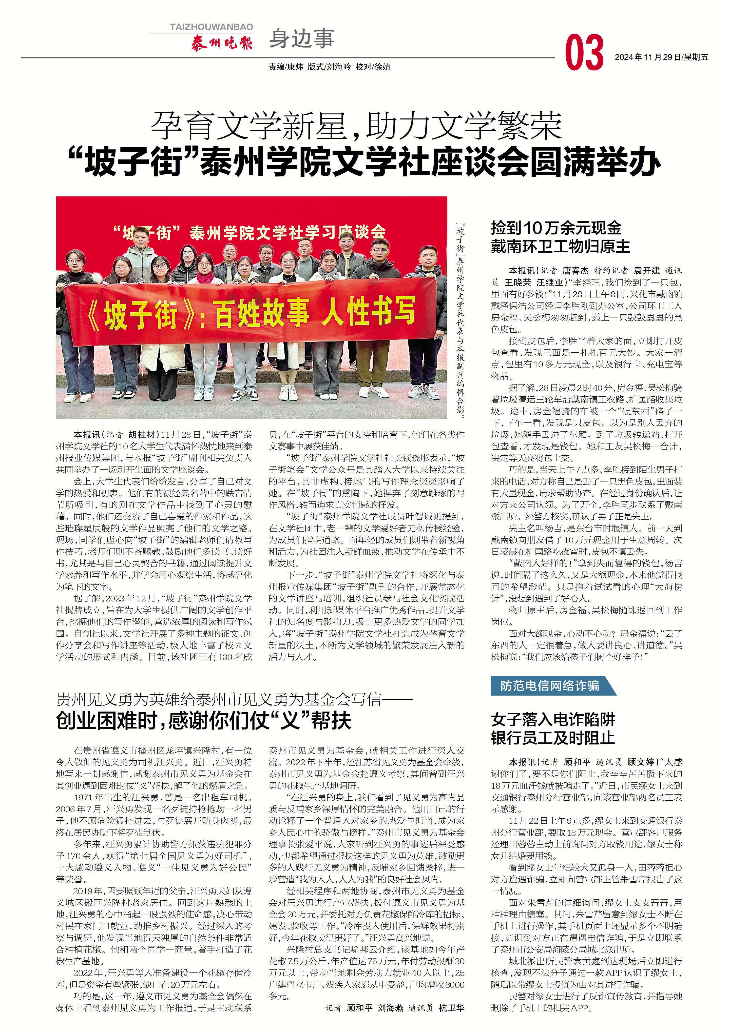 《学习强国》《泰州晚报》《坡子街笔会》11月29日-12月1日报道:“坡子街”LETOU国际米兰官网文学社座谈会圆满举办