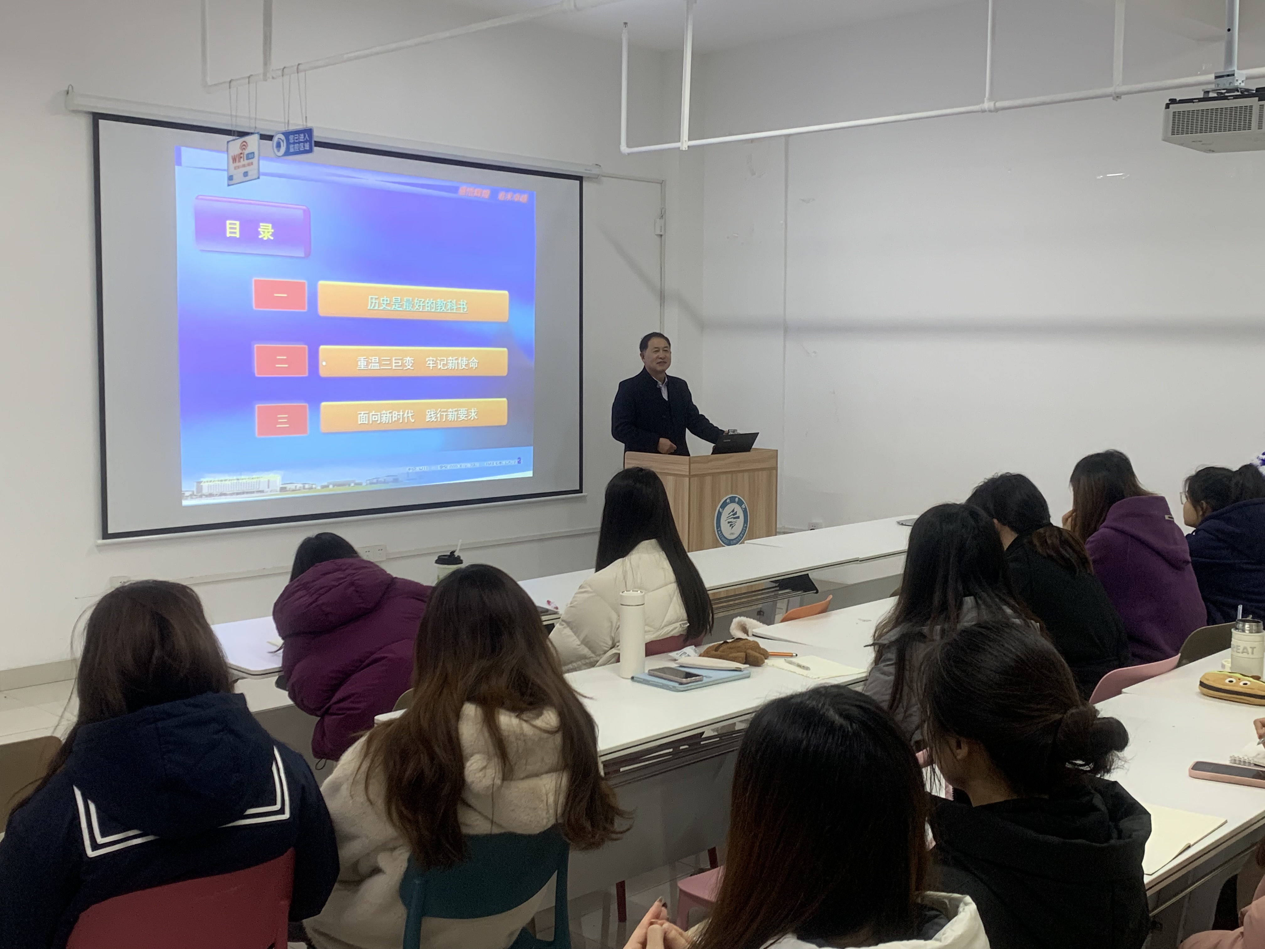 蔡桂如结合习近平总书记的重要讲话精神,从“历史是最好的教科书”“重温三巨变、牢记新使命”“面向新时代、践行新要求”三个方面进行了阐述,呼吁广大同学继承和发扬中国共产党党员的优秀品质,勇于担当责任,不负时代、不负韶华,奋发有为,建功立业,努力成为实现中华民族伟大复兴的生力军。