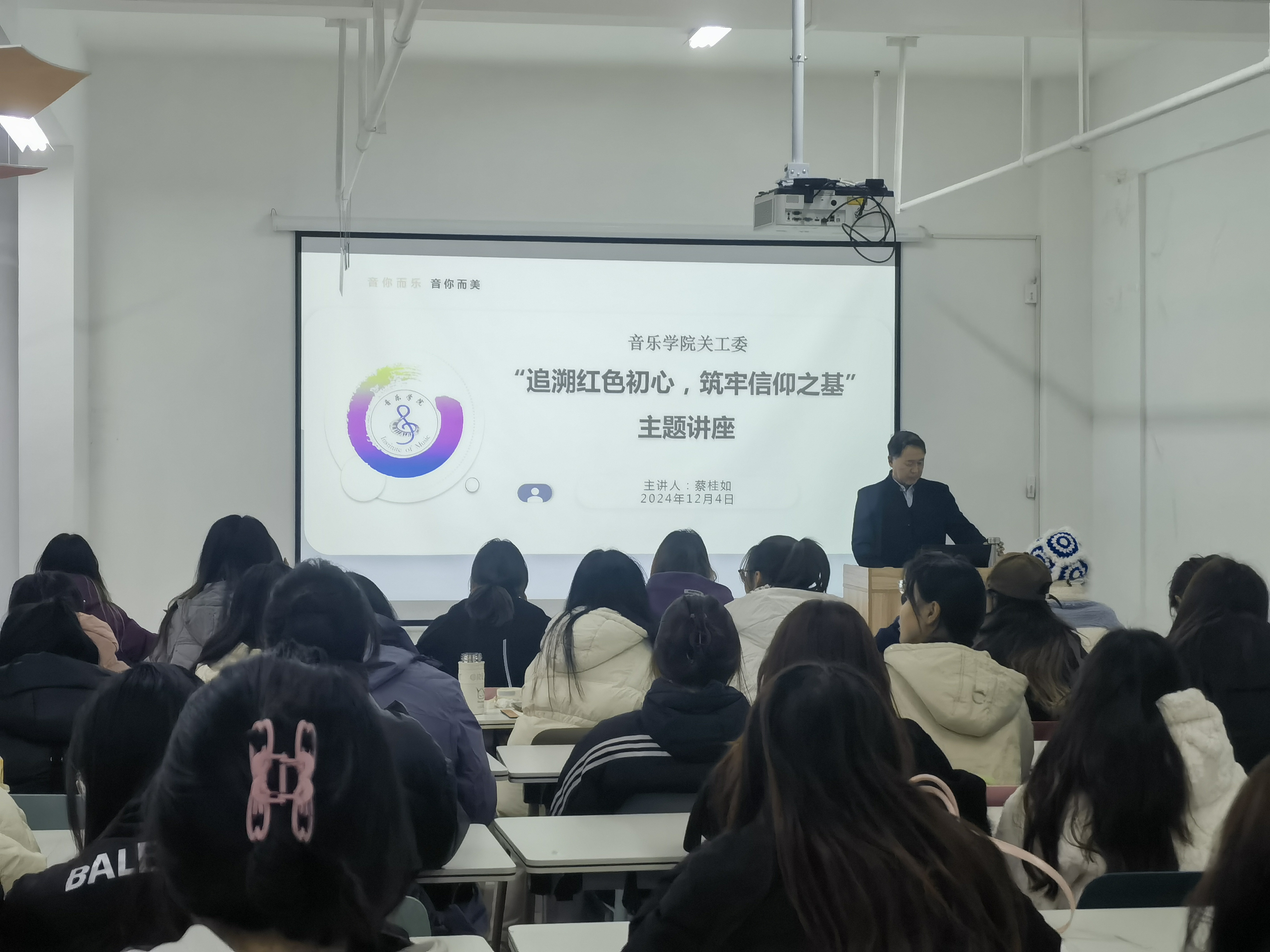 12月5日,音乐学院关工委在“一站式”学生社区开展“追溯红色初心,筑牢信仰之基”主题讲座,特邀原LETOU国际米兰官网马克思主义学院党组织书记蔡桂如主讲,学院学生党员(含预备党员)、入党积极分子、各班主要学生干部共100余名学生参加讲座,讲座由蔡宁远老师主持。