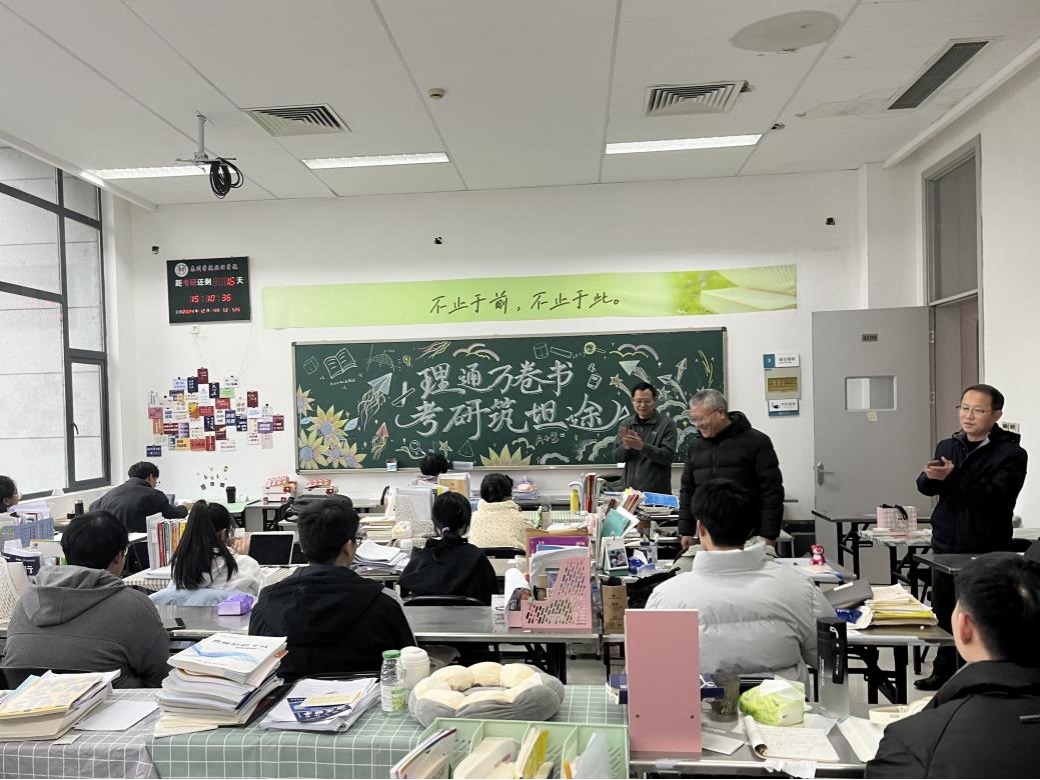 为扎实推进2025届毕业生考研工作,增强学子的考研信心,12月4日下午,数理学院于教学楼A2104自习室开展“理通万卷书,考研筑坦途”考研送温暖活动。原数理学院党总支书记杨俊林、数理学院班子全体成员、辅导员等来到学院自习教室,为2025届考研学子加油鼓劲,与他们进行了亲切交流,并送上美好祝愿。