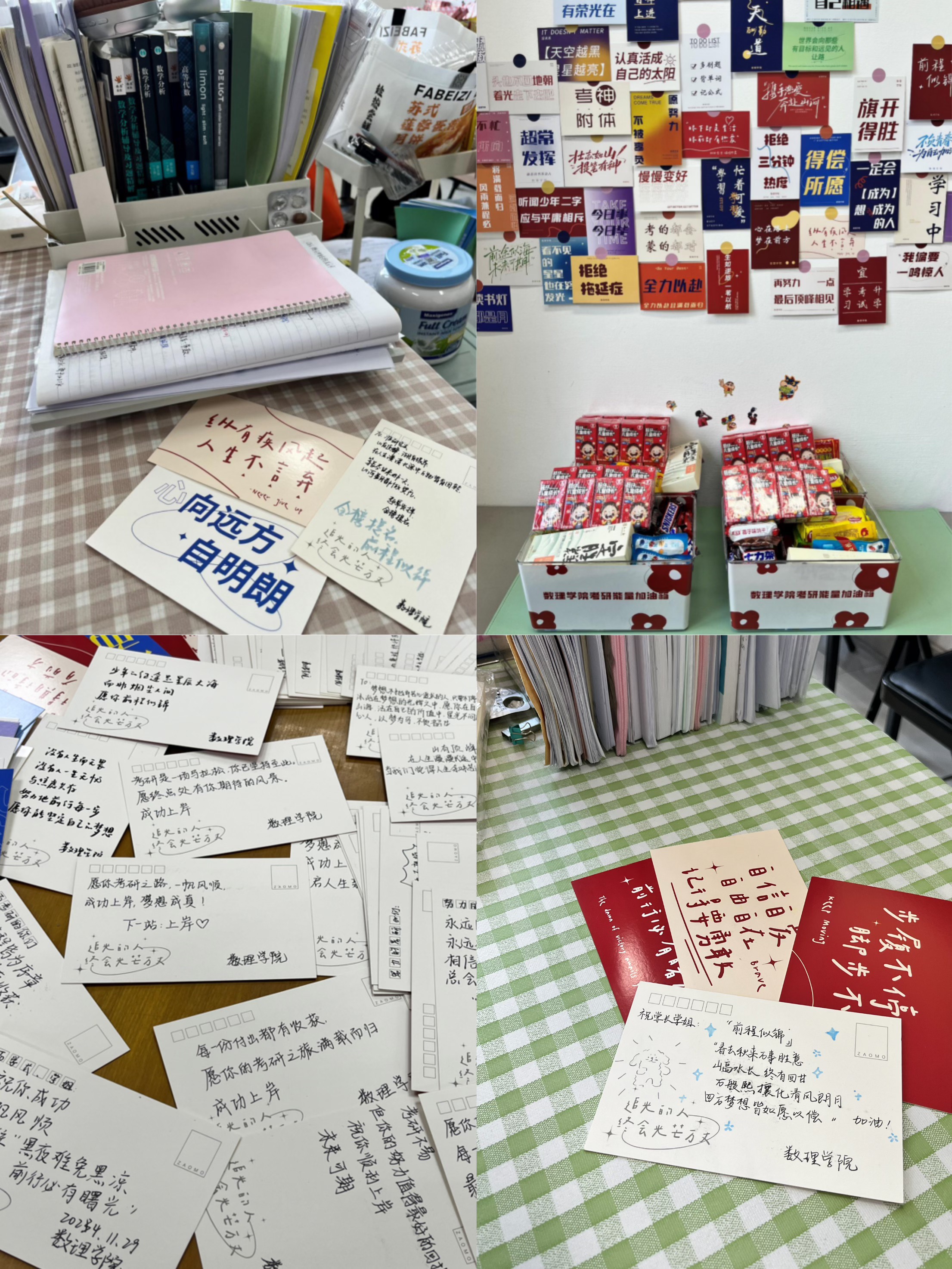 慰问期间,学院关工委精心准备了寓意“士气满满”的士力架、“一研为定”的定胜糕、“大吉大利”的奥利奥、“一路生花”的威化、“暖心满满”的暖宝宝等物品,放置于学院自习教室的能量加油站内,希望考生在备考过程中保持积极状态,注重劳逸结合。学院低年级学子为即将踏上考研征途的学长学姐们写下一张张承载着满满祝福寄语的明信片,最真挚的祝福在学生之间互相交融的同时,也在学院低年级学生心中种下考研的理想种子。暖心举措让正在寒冬中紧张备考的考研学子们真切感受到来自学院大家庭的爱与温暖。