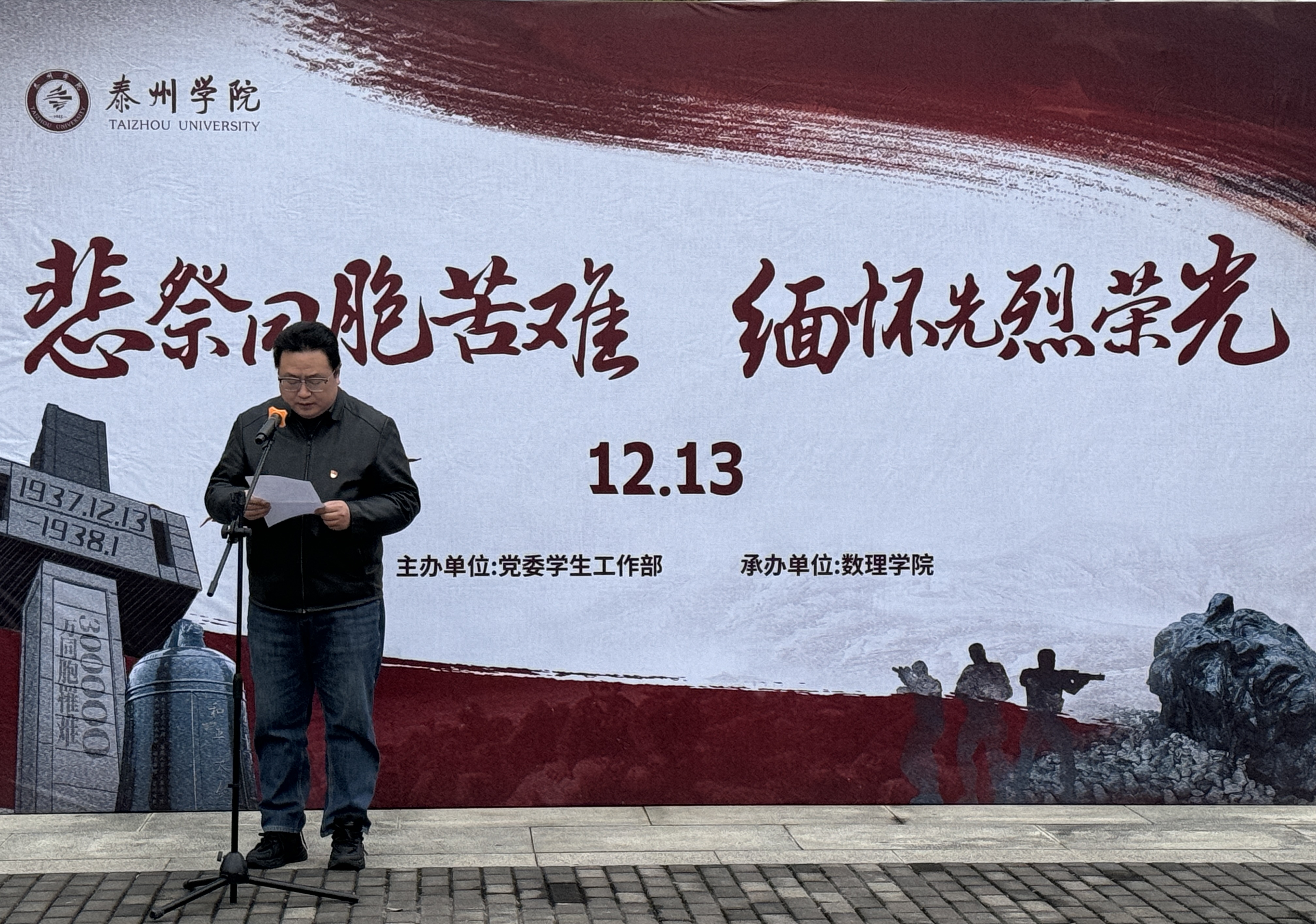 伴随着庄严的国歌声,鲜艳的五星红旗冉冉升起,全体师生肃立行注目礼并低头默哀一分钟,缅怀遇难的300000同胞。随后,学生代表王梓涵同学发言,呼吁同学们勿忘国耻,振兴中华。四位学生代表铿锵有力地朗诵《山河泣血,浩气长存》,表达了新时代青年们的心声。最后,数理学院党总支书记江峰进行国旗下讲话,他勉励同学们牢记中华民族艰苦卓绝的奋斗历程,鼓励同学们珍惜和平,努力学习,做新时代中国特色社会主义事业的接班人。