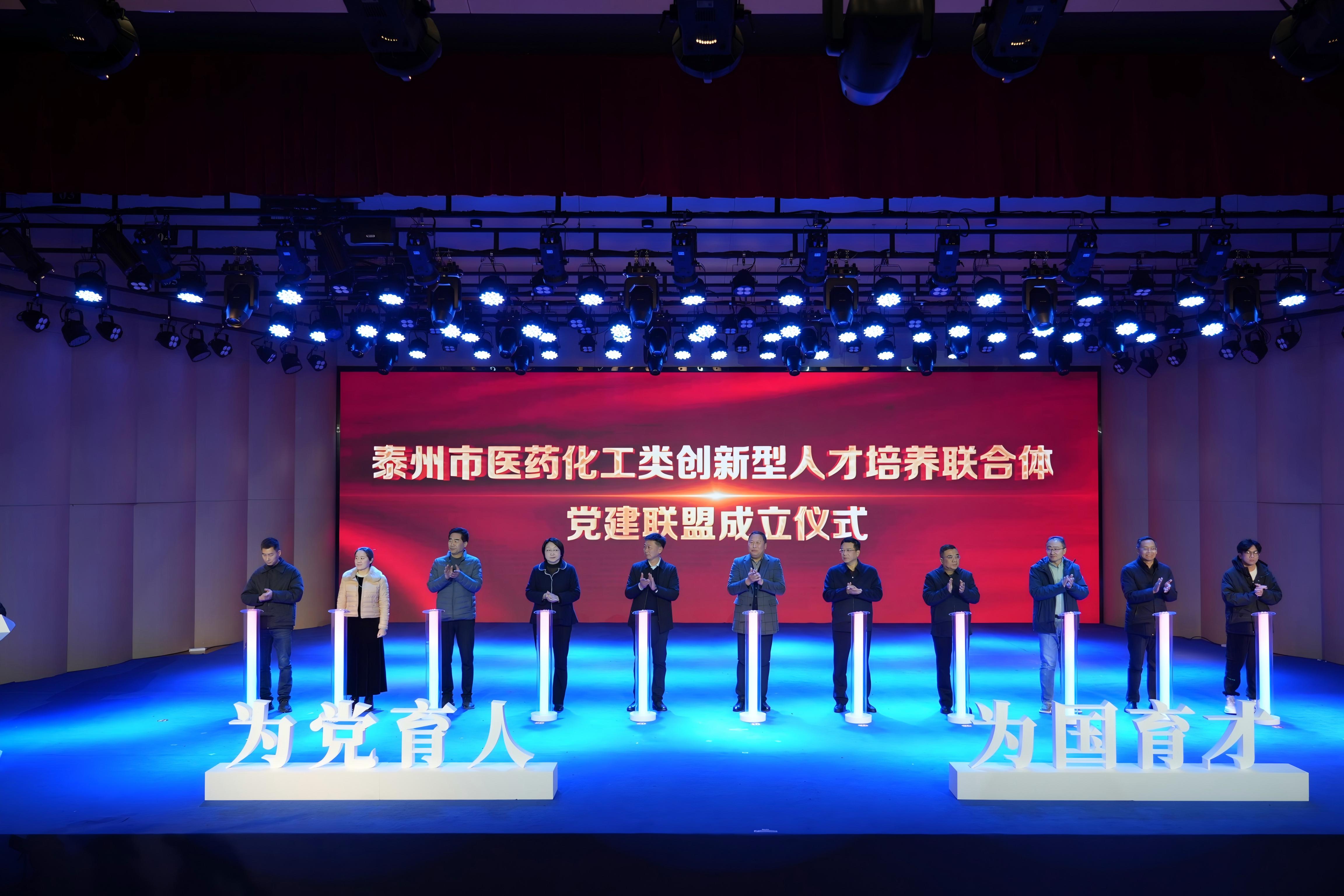 活动现场,市委统战部、市发改委、市工信局、市市场监督管理局、各高校等部门(单位)领导按下启动柱,共同见证泰州市医药化工类创新型人才培养联合体党建联盟成立。