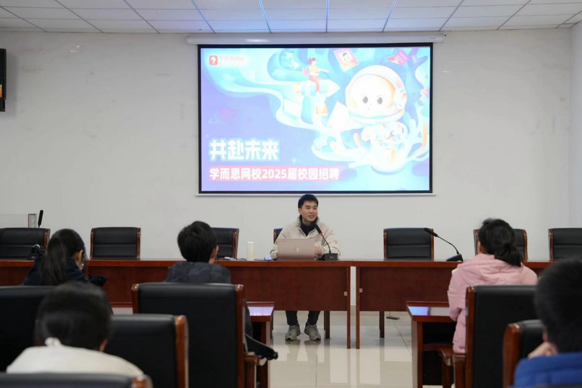江苏学而思教育科技有限公司吴义龙老师作宣讲。他从学而思网校的发展历程、业务体系、多元化培训课程、职业发展前景等方面对集团进行了全面介绍,详细讲解了招聘要求、薪酬福利及面试流程。在互动环节中,同学们积极提问,招聘团队耐心解答,现场气氛活跃。