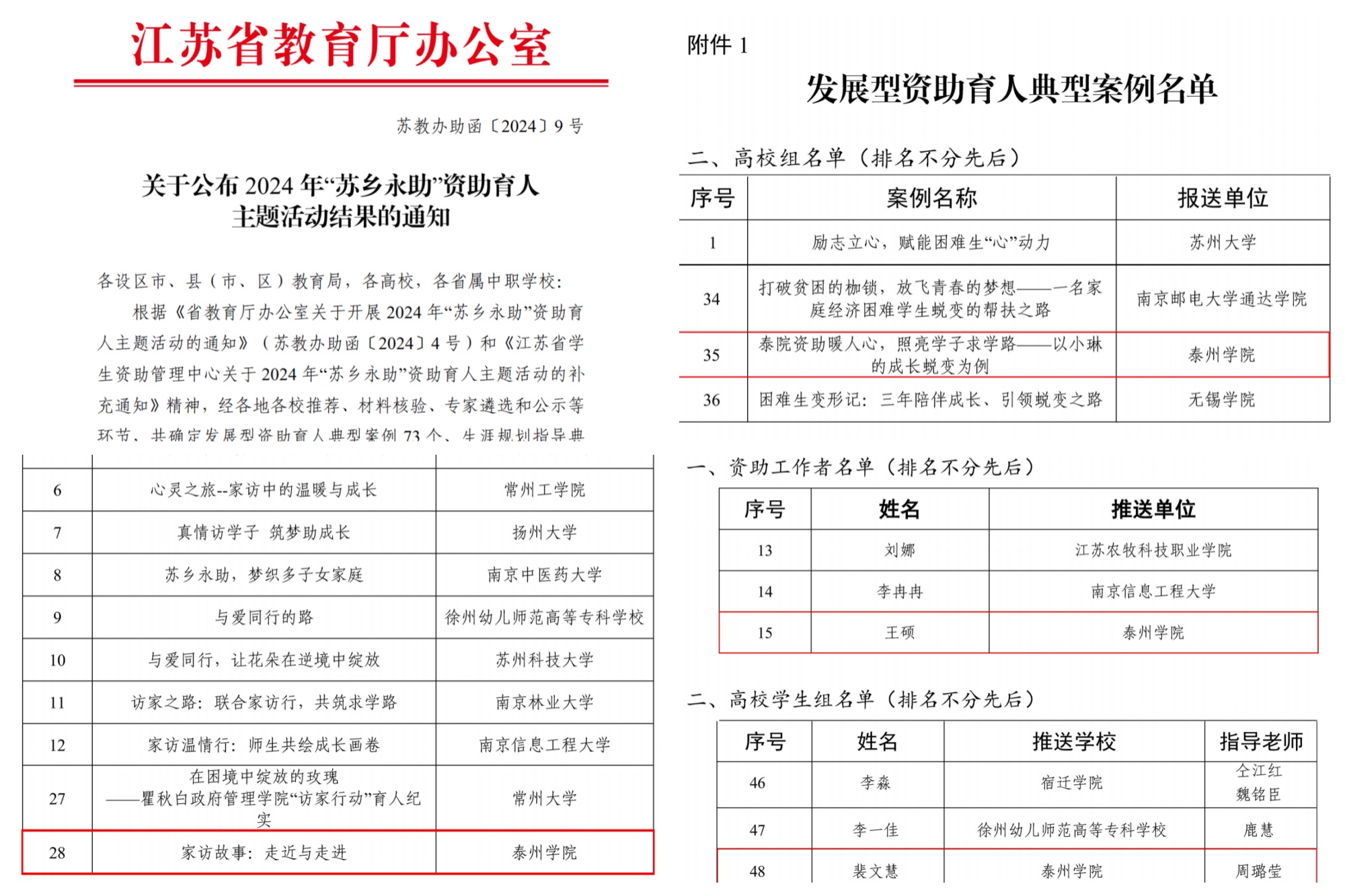 近日,江苏省教育厅公布了2024年“苏乡永助”资助育人主题活动评选结果,米兰官网获评发展型资助育人和“访家之路”2项典型案例,2名师生被授予江苏省“学生资助宣传大使”荣誉称号,实现米兰官网资助工作在省级奖项新的突破。