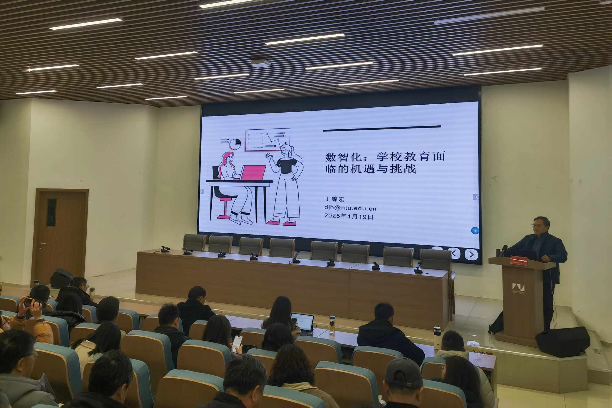 丁锦宏作题为“数智化:学校教育面临的机遇与挑战”的专题报告。他围绕专业建设、课程建设、教学改革、教师发展、学生培养等主题,带领大家回顾了人类文明发展的数字化脉络,深入探讨了数智化对教育领域的影响,介绍了基于人工智能的循证教学,展望了数智化教学的未来。丁锦宏呼吁教育者深入思考如何更好地结合技术与人文,创造出更有温度、更人性化的数智教学环境,助力新质人才培养。