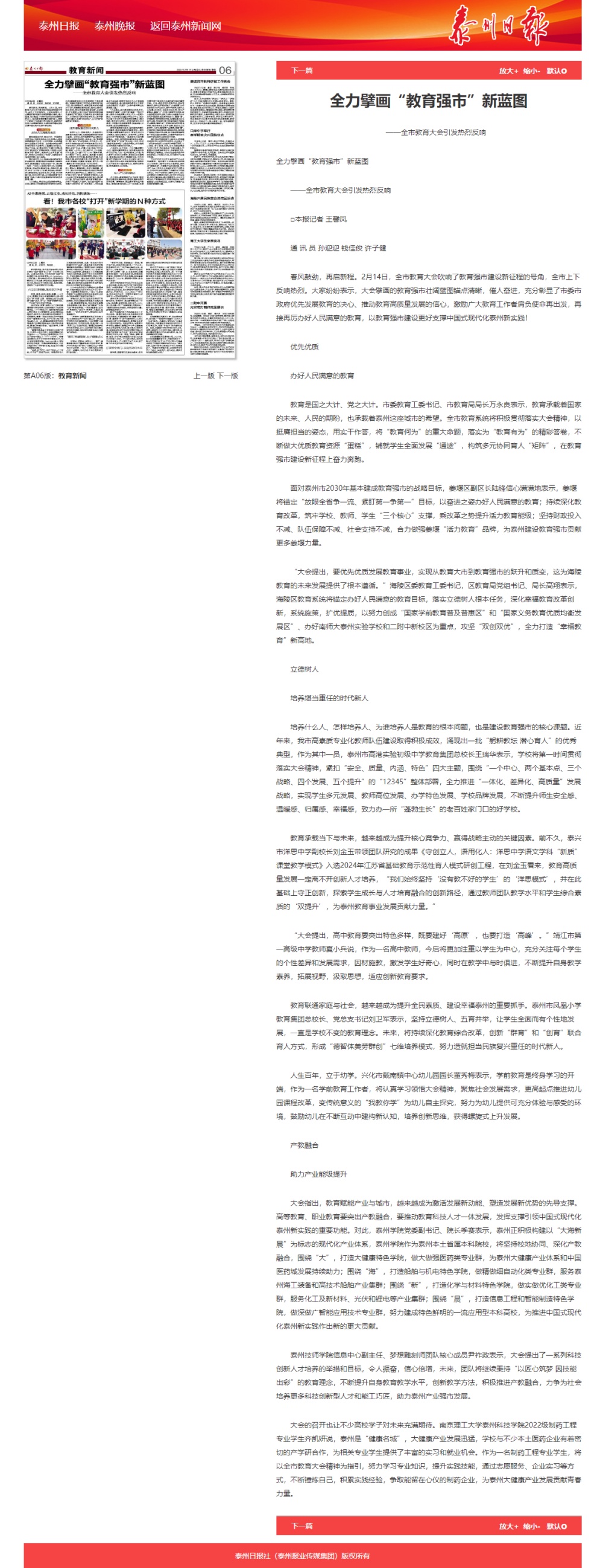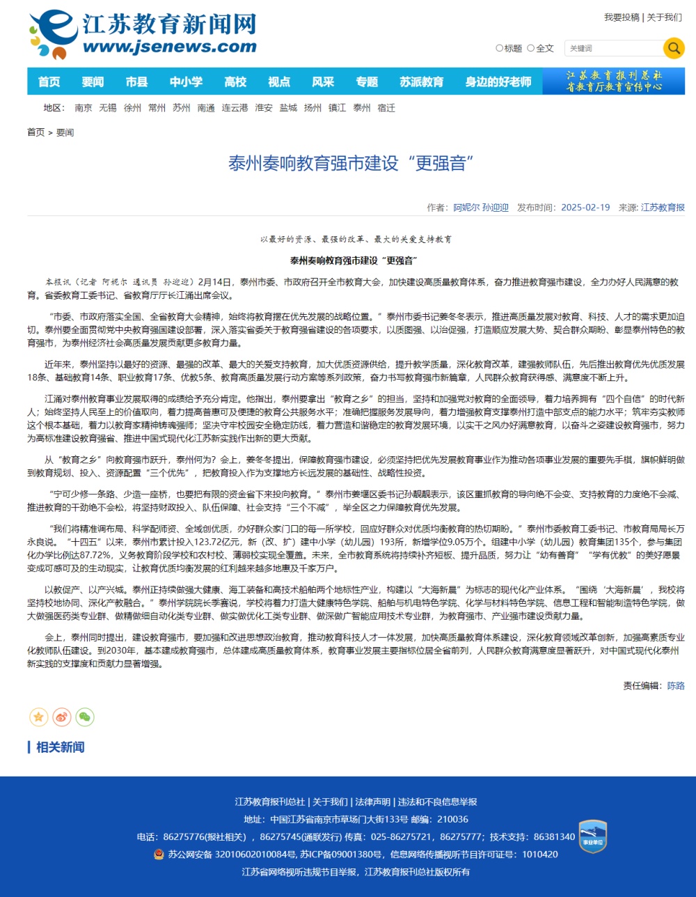 《江苏教育新闻网》《泰州日报》2025年2月19日报道全市教育大会,米兰官网党委副书记、校长季赛作交流发言