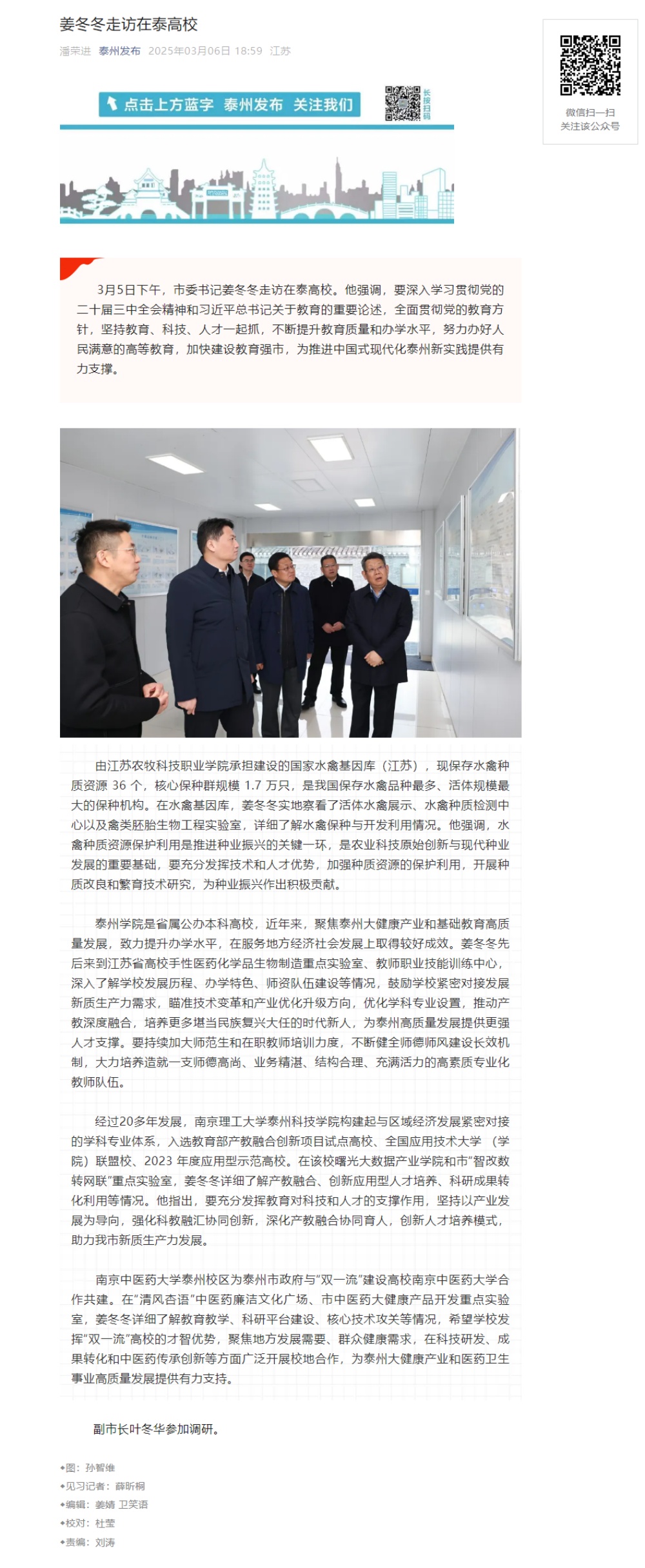 《泰州发布》2025年3月6日报道《姜冬冬走访在泰高校》