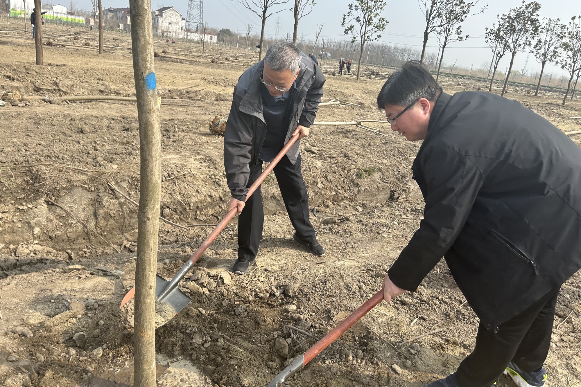 植树现场,三五成组的“清风雁阵”在阡陌间次第铺开,大家分工协作,相互配合,放苗扶树、挥锹培土、提水浇灌、扶苗固根,在大家的共同努力下,一株株新栽种的“清风树”迎风挺立,焕发勃勃生机。
