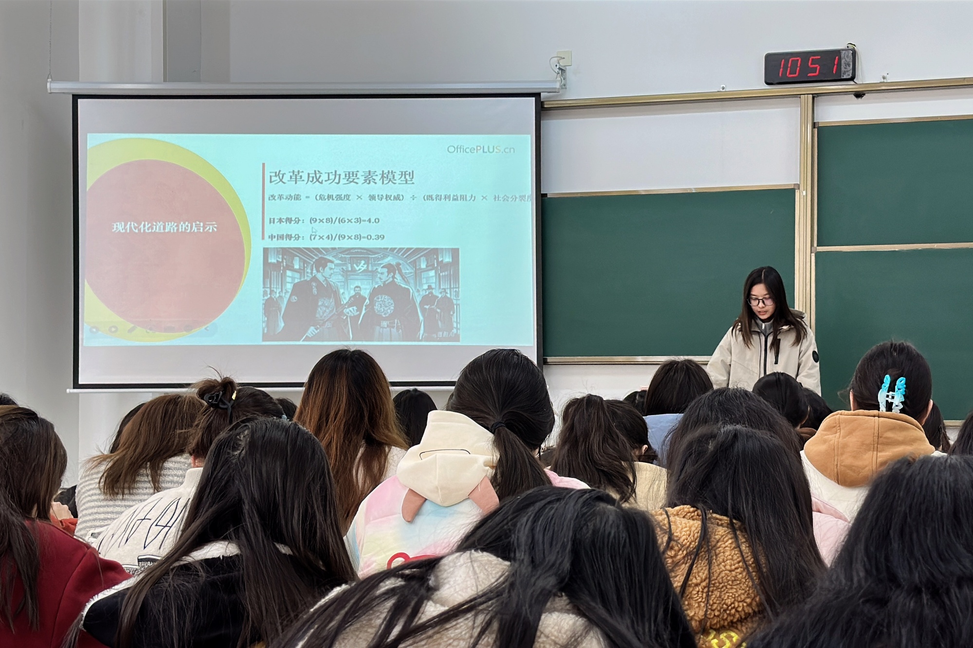 多维度教学,打造思政教育新模式。通过纪录片与教材文本学习,学生在视听冲击与文本研读中,深刻感悟历史的厚重。座谈研讨环节,师生思想碰撞,激发思维火花,让真理越辩越明。课堂分小组汇报,学生从被动接受转为主动探索,锻炼表达与协作能力。2024级小学教育(数学)2班龚愉雯、秦琪同学在汇报中表示:“为了筹备本次汇报,我们借助影视与课本知识,搭建起对中日维新变法、救亡图存认知的桥梁。大家相互配合、形成合力,不仅加深了我们对近代历史的理解,还锻炼了团队协作与表达能力,切实体会到历史对当代发展的借鉴意义。”2024级旅游管理专业潘子炎同学认为:“此次活动布置的宿舍观影与学习,巧妙地将集体学习氛围融入日常起居环境,拉近了知识与生活的距离,让我们能在轻松自在的氛围中吸收知识。老师的点评专业且精准,既能肯定我们的努力与创意,又能指出不足并给予建设性意见,为我们的学习指明方向。这种多样化、互动式的课堂形式,有效提升了我们的参与热情 。”这一系列环节,不仅打通了“第一课堂”与“第二课堂”的隔阂,更让思政教育从单向度走向多维度,从单一化走向多样化。
