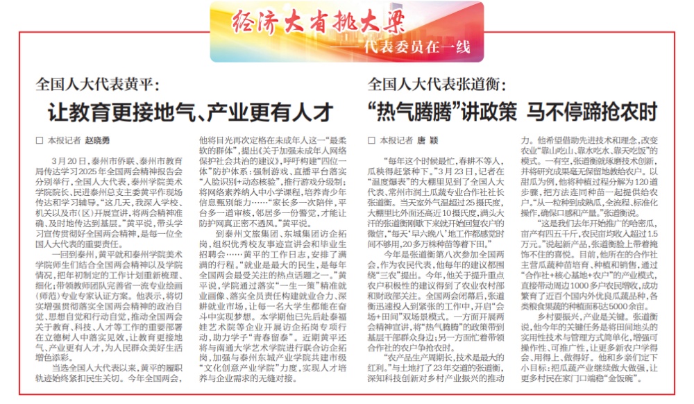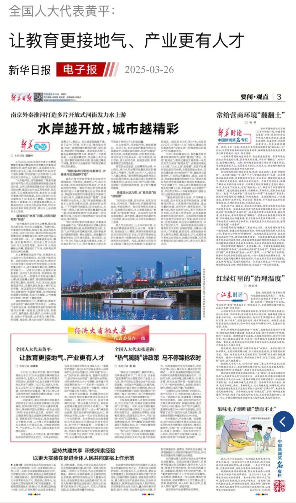 《新华日报》2025年3月26日报道《全国人大代表黄平:让教育更接地气、产业更有人才》