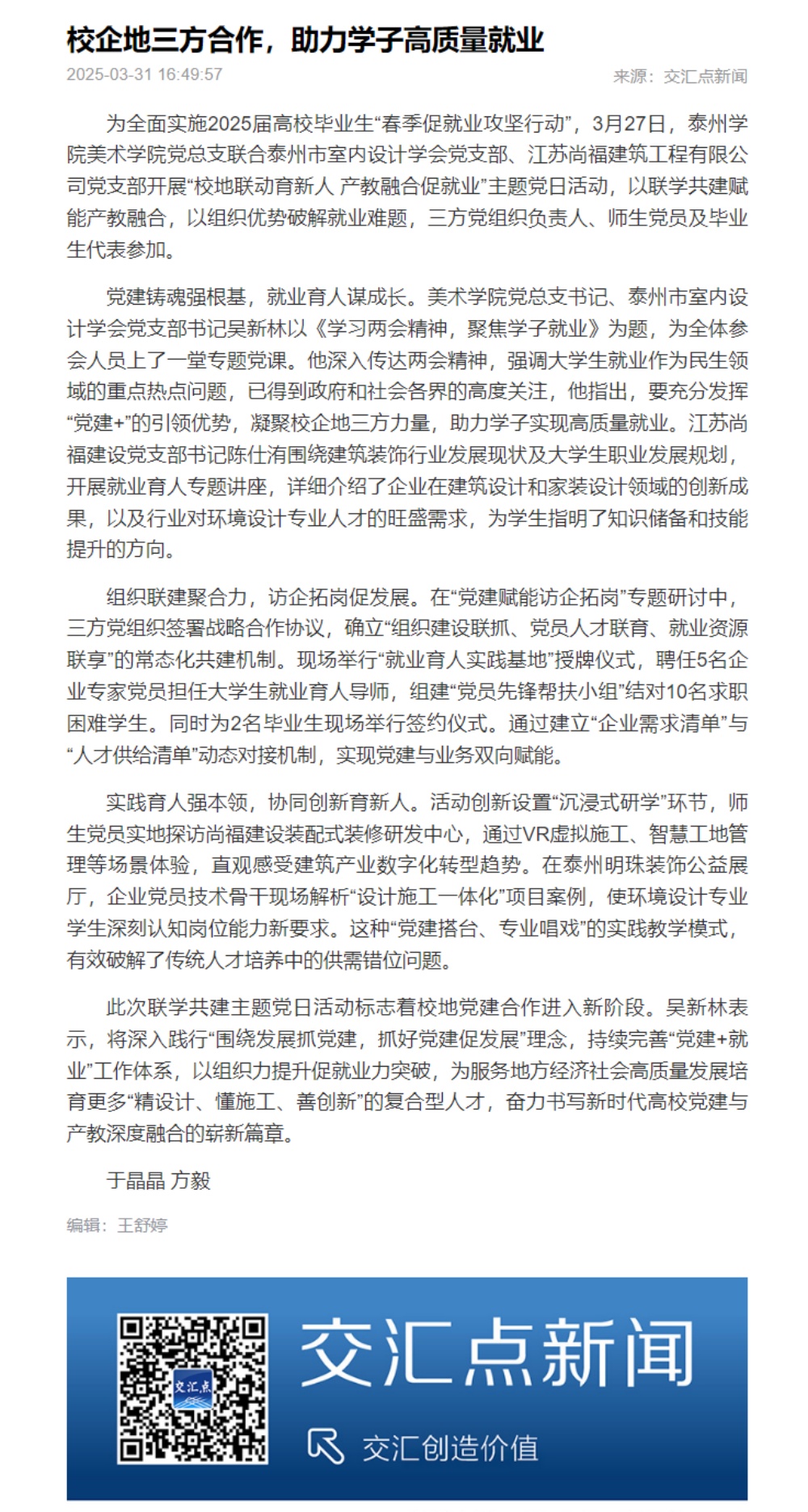 《交汇点新闻》2025年3月31日报道《校企地三方合作,助力学子高质量就业》