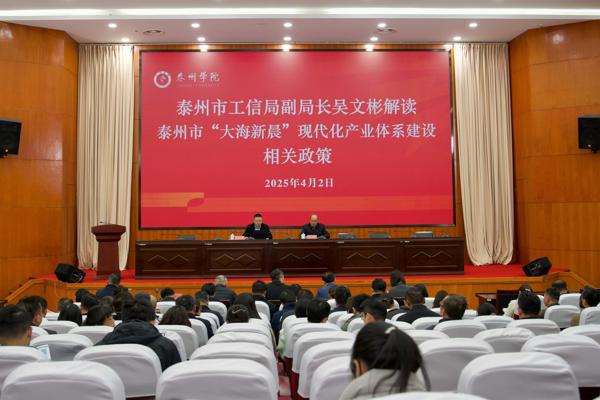 为主动对接泰州市“8+13+X”产业体系,会议邀请市工信局党组成员、副局长吴文彬作《向新而行,以质求远,加快构建以“大海新晨”为标志的现代化产业体系》专题讲座,通过深度解读泰州市“大海新晨”现代化产业体系建设相关政策和产业发展需求,为校地合作提供理论支撑与实践参考,进一步明晰学校服务泰州的主攻方向。