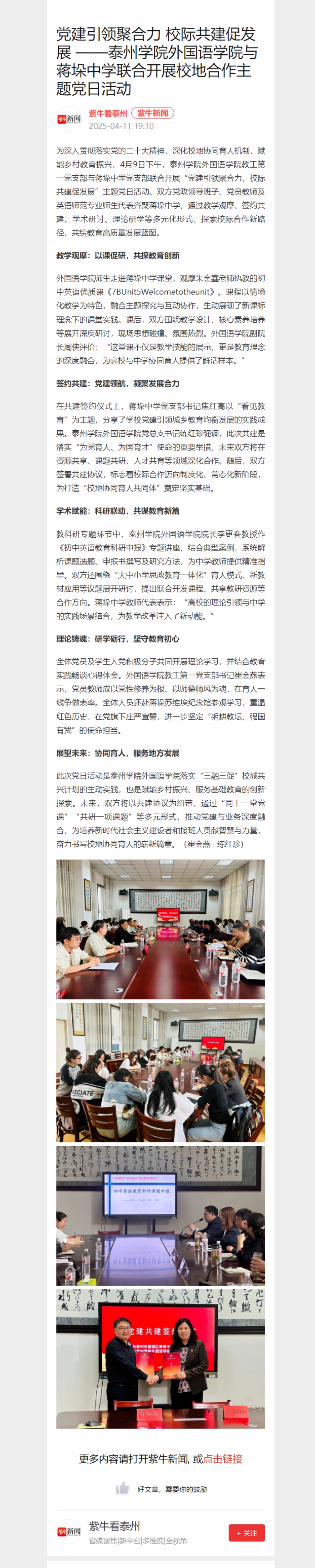 《扬子晚报》《紫牛新闻》2025年4月11日报道《党建引领聚合力 校际共建促发展 ——LETOU国际米兰官网LETOU国际米兰官网与蒋垛中学联合开展校地合作主题党日活动》