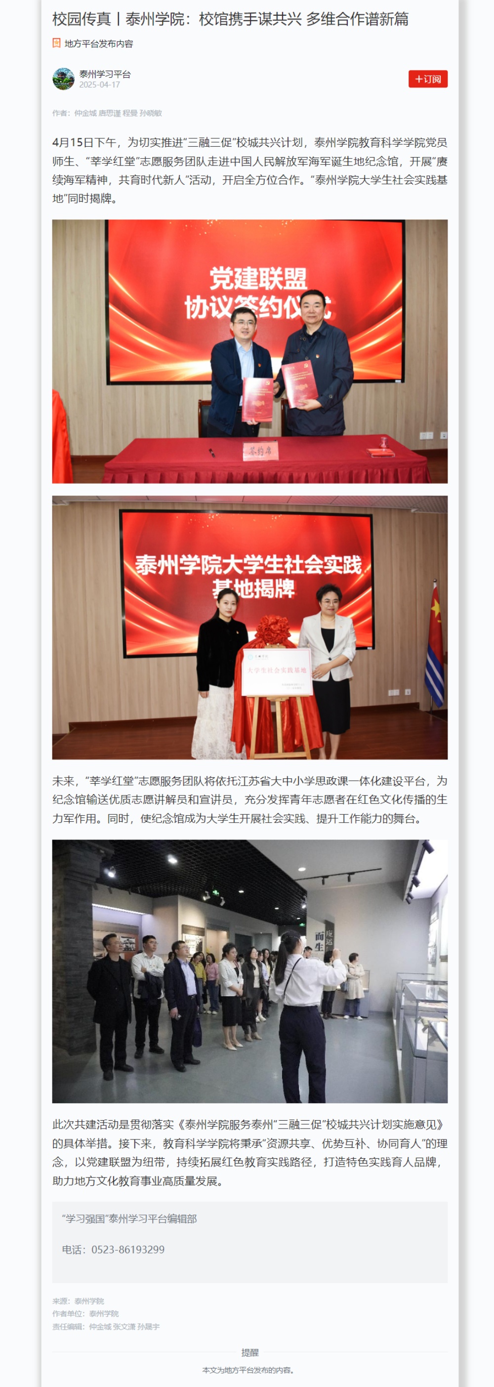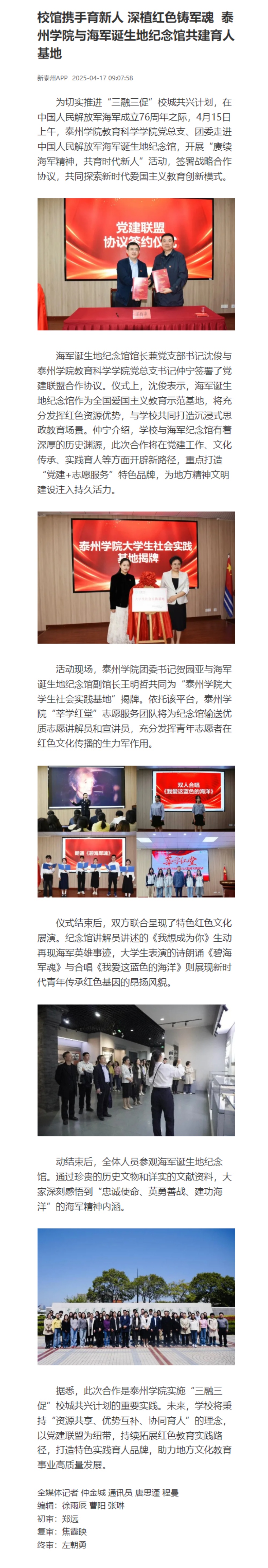《学习强国》《新泰州》2025年4月17日报道《LETOU国际米兰官网:校馆携手谋共兴 多维合作谱新篇》