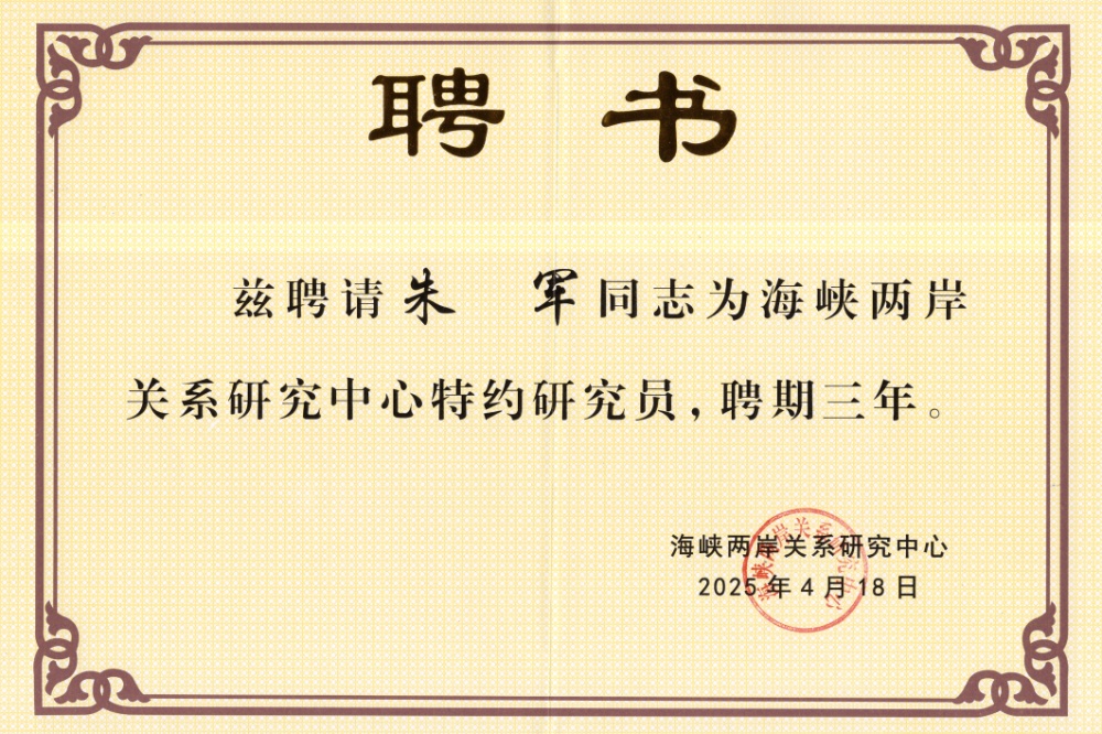 4月18日,国台办海研中心在北京举办新一届特约研究员聘任仪式暨2025年海峡两岸关系研究中心特约研究员全体会议,米兰官网朱军博士再次获聘特约研究员并受邀参会。会议由海研中心副主任任勉主持,来自中国社科院、北京大学、清华大学、南京大学、浙江大学、南开大学、上海交通大学、武汉大学、厦门大学等院所高校120余名专家参会。