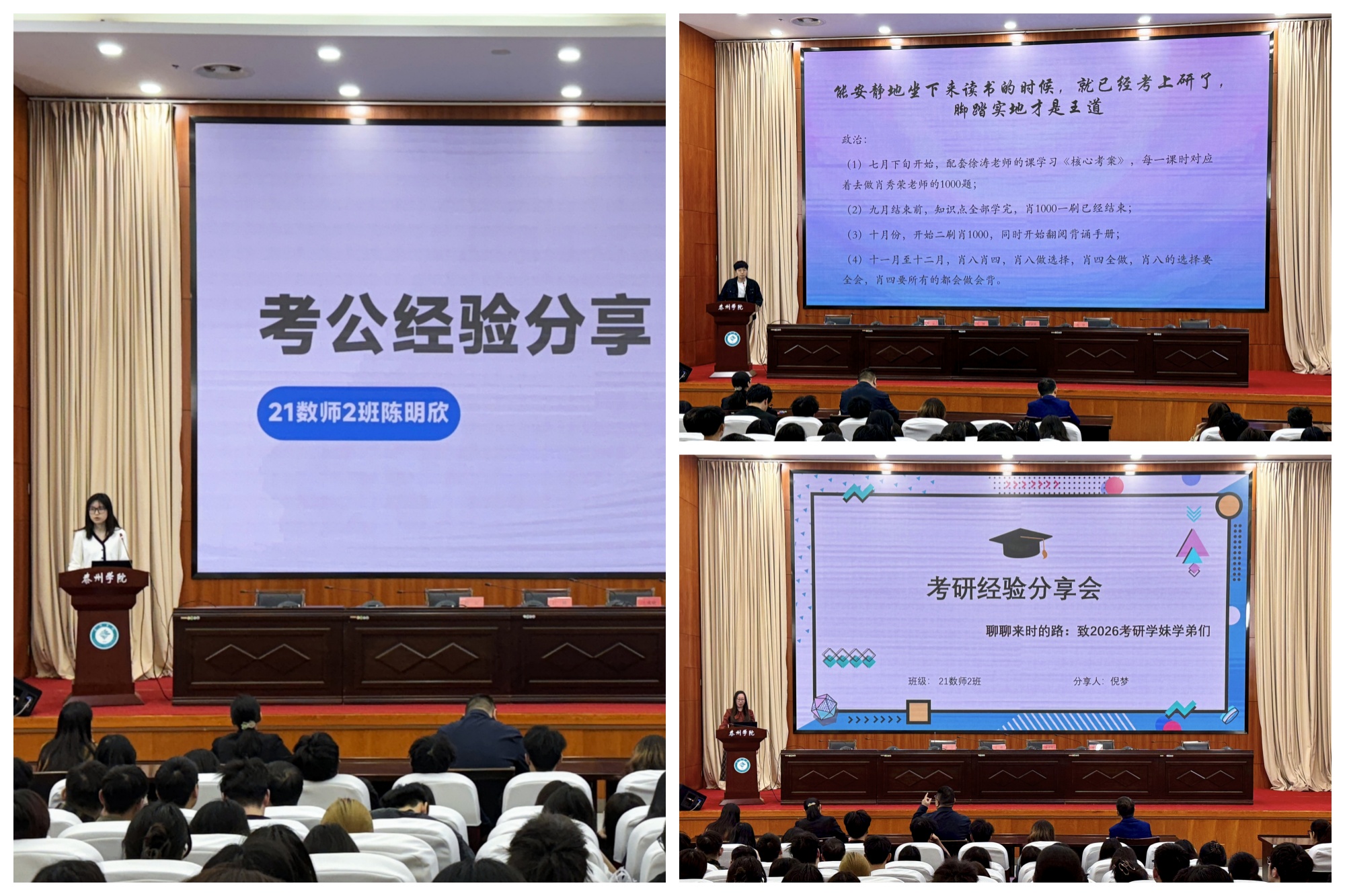 在上岸经验分享环节,五位已成功考取研究生、公务员、教师编制和银行的2025届优秀毕业生,结合自身备考历程作分享。他们鼓励学弟学妹们尽早确定目标,借鉴前人成功经验,少走弯路;充分利用秋招,实现人生理想。