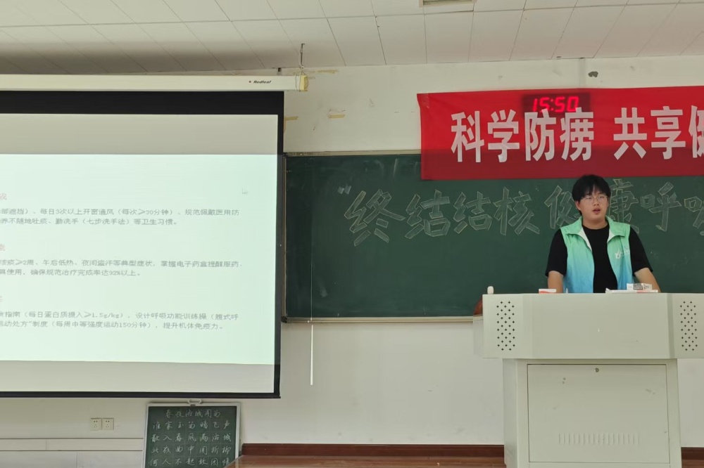 讲座中,团队负责人许铭浩结合全球结核病最新数据,深入浅出地讲解了结核病的病原学特征、传播途径及高危人群,并现场演示了规范的咳嗽礼仪和日常防护措施。他强调,持续两周以上的咳嗽、低热、盗汗是结核病的典型症状,但大学生群体往往将其误认为普通感冒而延误就诊。他呼吁师生从日常做起,通过宿舍每日通风30分钟、参与防结核短视频创作等实际行动,共同构筑校园结核病防控网络。