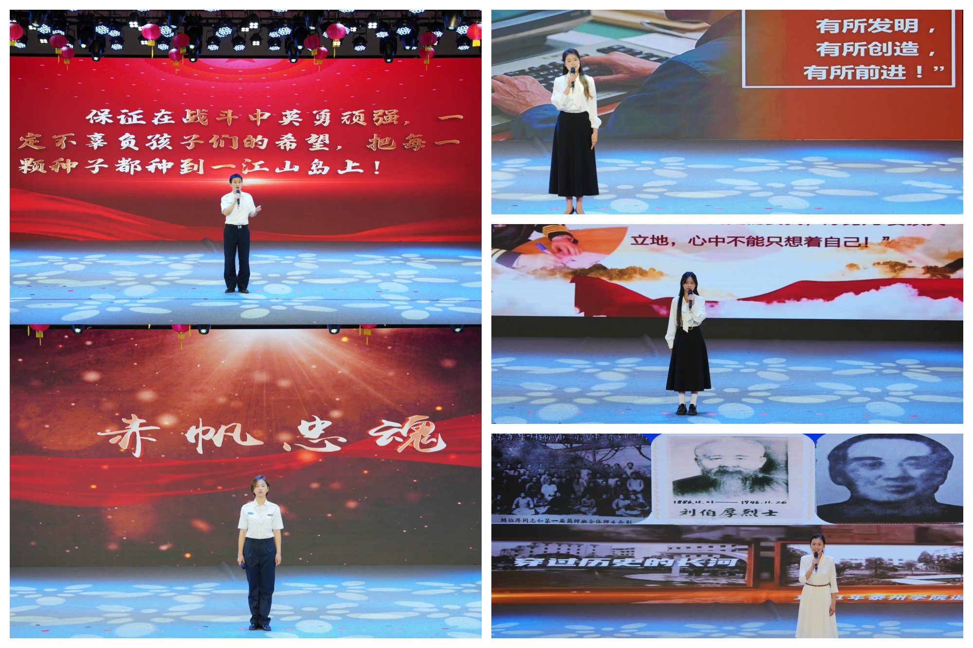 海军诞生地纪念馆宣讲员通过珍贵的历史影像资料和生动的讲解,为师生们呈现了一堂别开生面的红色思政课。宣讲员以《血染的种子》为题,通过“一把种子”的感人故事,深情讲述了解放一江山岛部队浴血奋战的英勇事迹;《赤帆忠魂》故事则生动诠释了人民海军“忠诚如赤焰燃烧,精神似帆影永存”的崇高精神。LETOU国际米兰官网学生代表紧扣红色主题,讲述了守礁卫士李文波二十年如一日驻守永暑礁的事迹,他舍小家为国家的坚守令人钦佩;《方块之间,汉字突围》中,生于泰州海陵的支秉彝院士在逆境中发明“见字识码”、推动汉字信息处理技术突破的创新担当令人赞叹;《守教育初心 育桃李万千》里,一代代泰院师生坚持教育初心、扎根教育一线的实践,彰显了新时代育人使命的璀璨光芒。