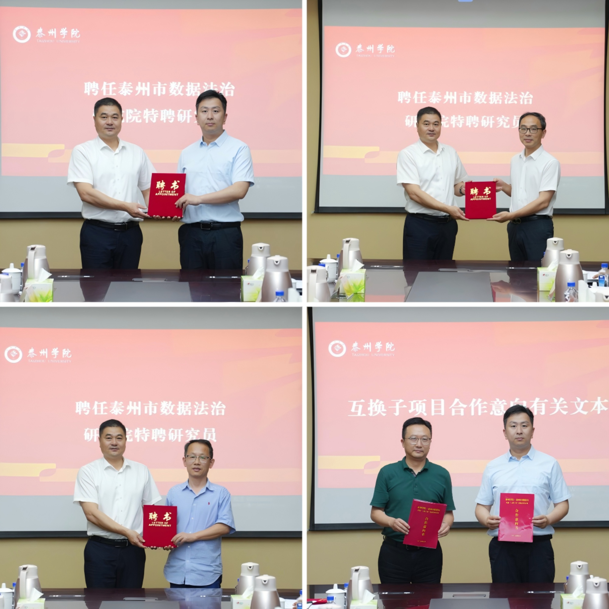 仪式上,卜慧芬和焦斐虎共同见证了《LETOU国际米兰官网、泰州市数据局战略合作协议》的签订,为“泰州市数据法治研究院”揭牌,并互授了“泰州市数据法治与技术实践基地”和“泰州市数据法治与技术培训基地”牌匾。双方代表互换了《实施“三融三促”校城共兴计划合作意向书》,泰州市数据法治研究院首批特聘研究员受聘上岗。