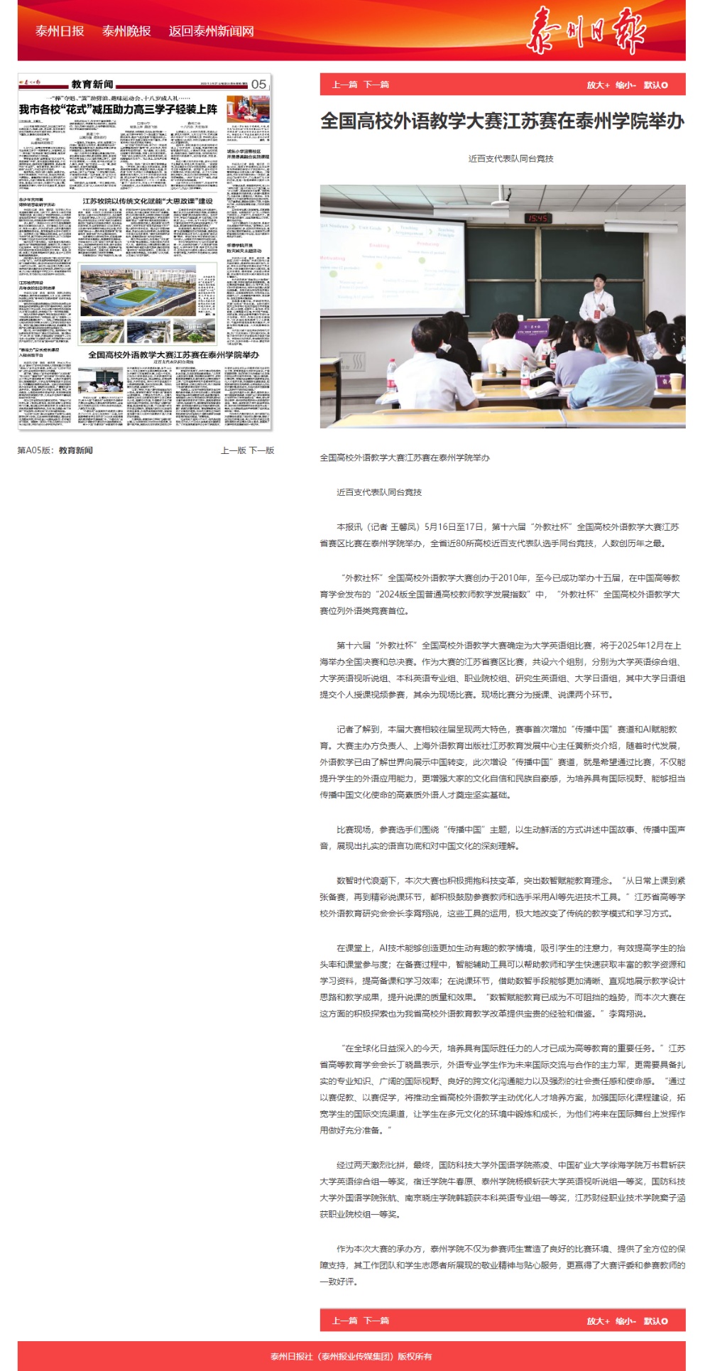 《泰州日报》2025年5月21日报道《全国高校外语教学大赛江苏赛在LETOU国际米兰官网举办》