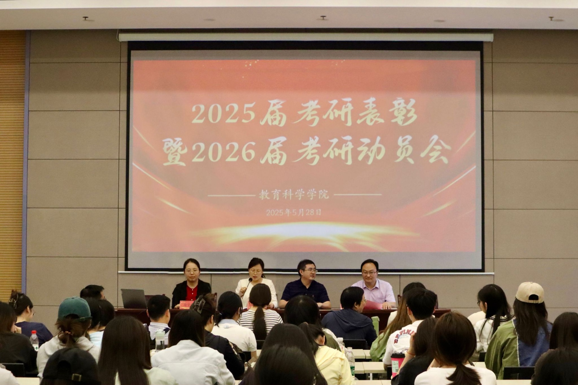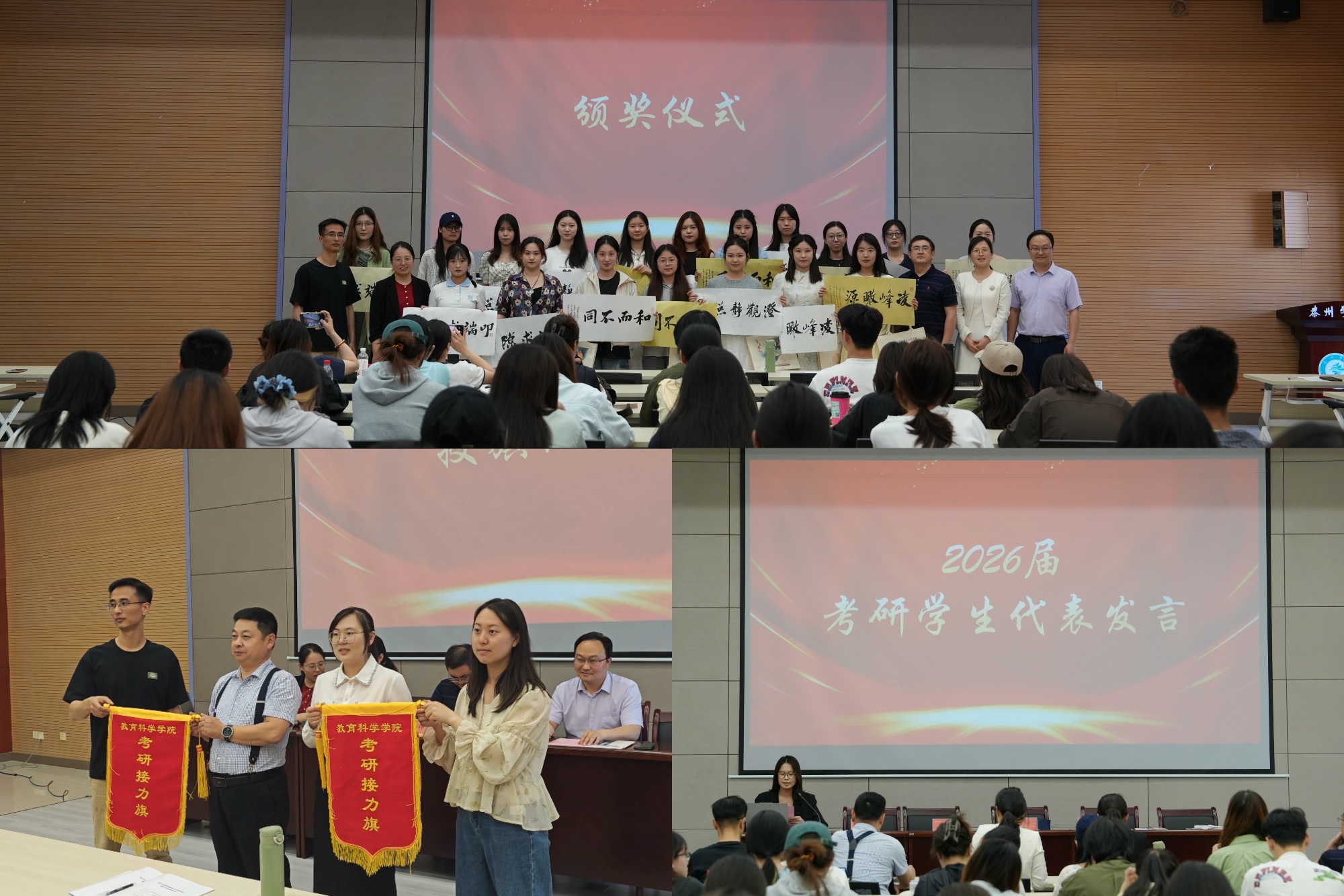2025届毕业班辅导员、班主任代表将象征着学院考研精神传承的“考研接力旗”郑重传递给2026届辅导员和班主任。4位考研学生代表从“高效时间管理”“跨专业备考策略”“复试逆袭技巧”“海外升学全流程”等方面分享经验。2026届考研学生代表张子怡表示,将以学长学姐为标杆,秉持“黄沙百战穿金甲,不破楼兰终不还”的信念,在备考征程中书写教科人的拼搏篇章。