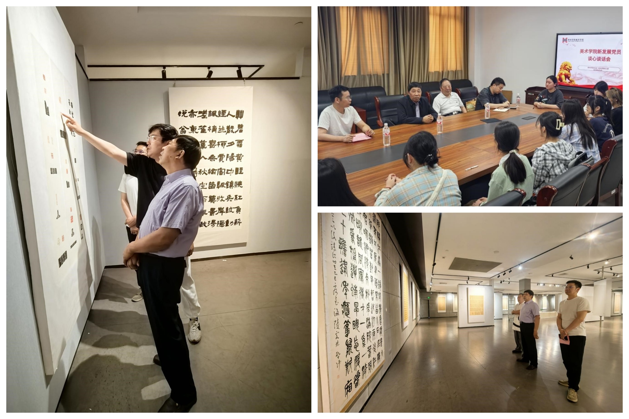 毕业展参观指导:以艺术实践见证育人成果。活动最后,徐金城教授一行参观了美术学院书法专业毕业展。在展厅中,领导仔细观看每一幅作品,从笔法章法、文化内涵、创新表达等方面与师生交流,对学生作品中展现的传统书法技艺传承与现代艺术创新给予充分肯定。他鼓励同学们坚持以美育人、以文化人,将专业学习与社会需求相结合,用艺术作品传递正能量。