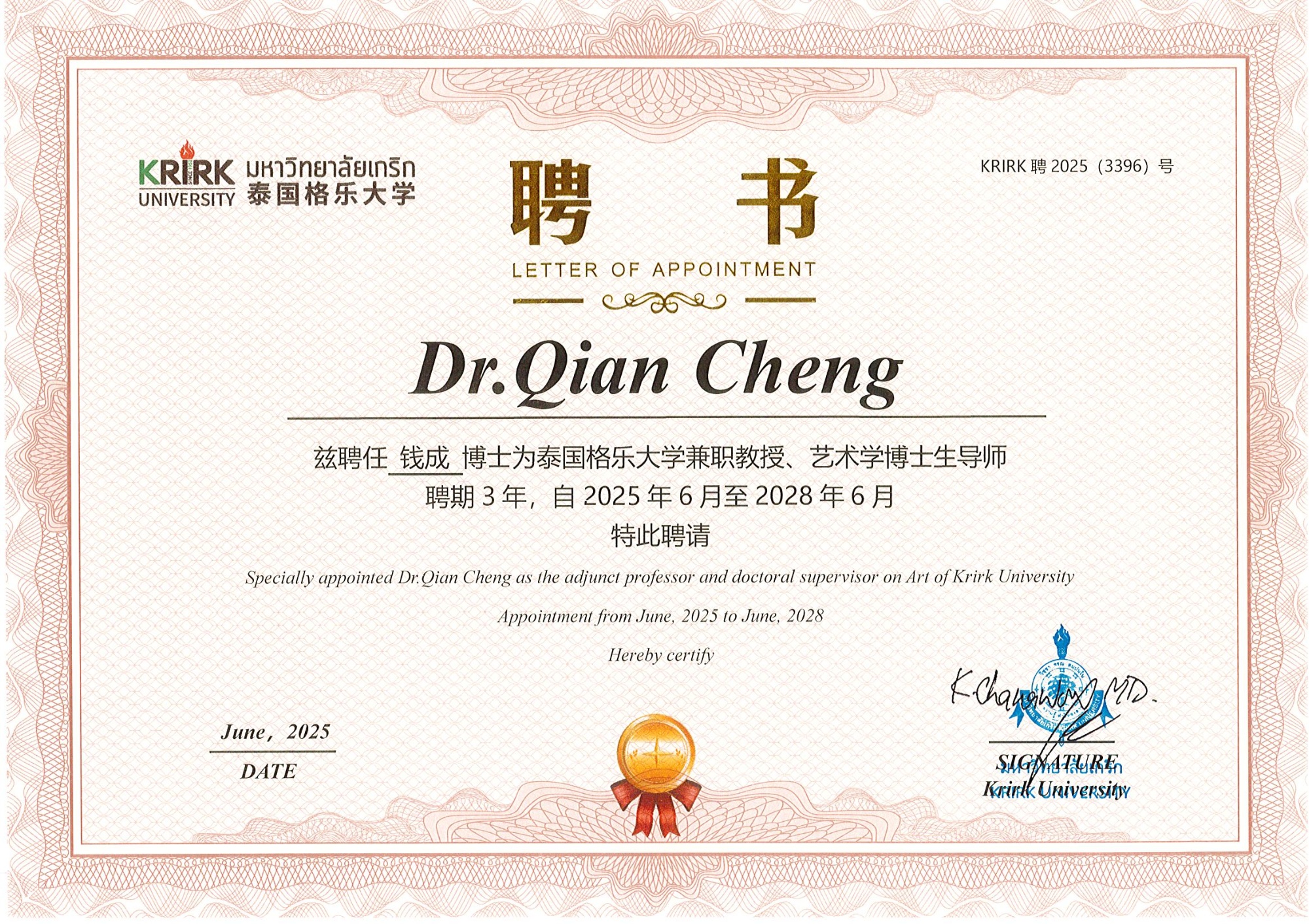 近日,人文学院钱成教授获聘为泰国格乐大学兼职教授、艺术学专业(戏剧学方向)博士生导师。