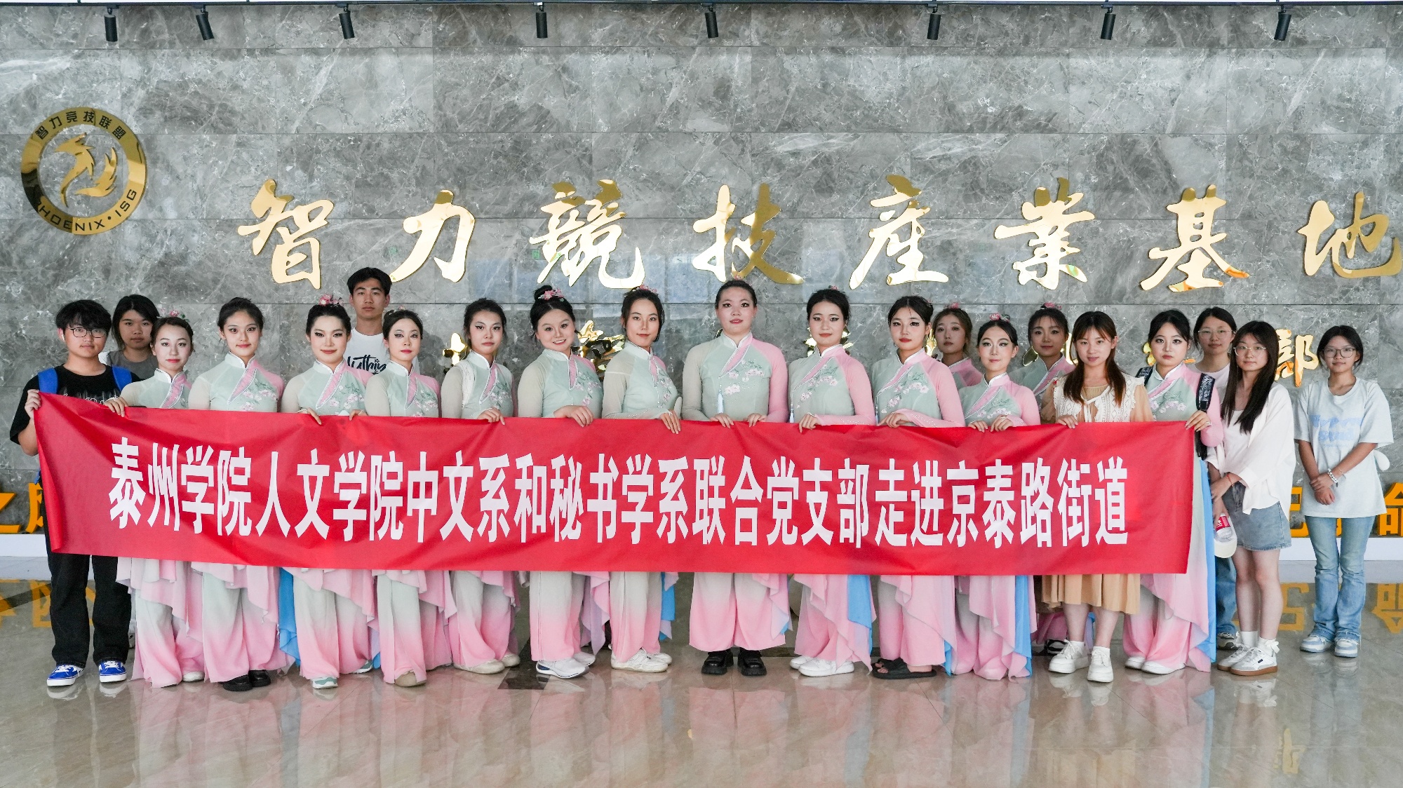 6月6日,人文学院中文系与秘书学系联合党支部师生应泰州市拥军志愿者联合会的邀请,走进京泰路街道,参加纪念中国人民抗日战争暨世界反法西斯战争胜利80周年文艺汇演。