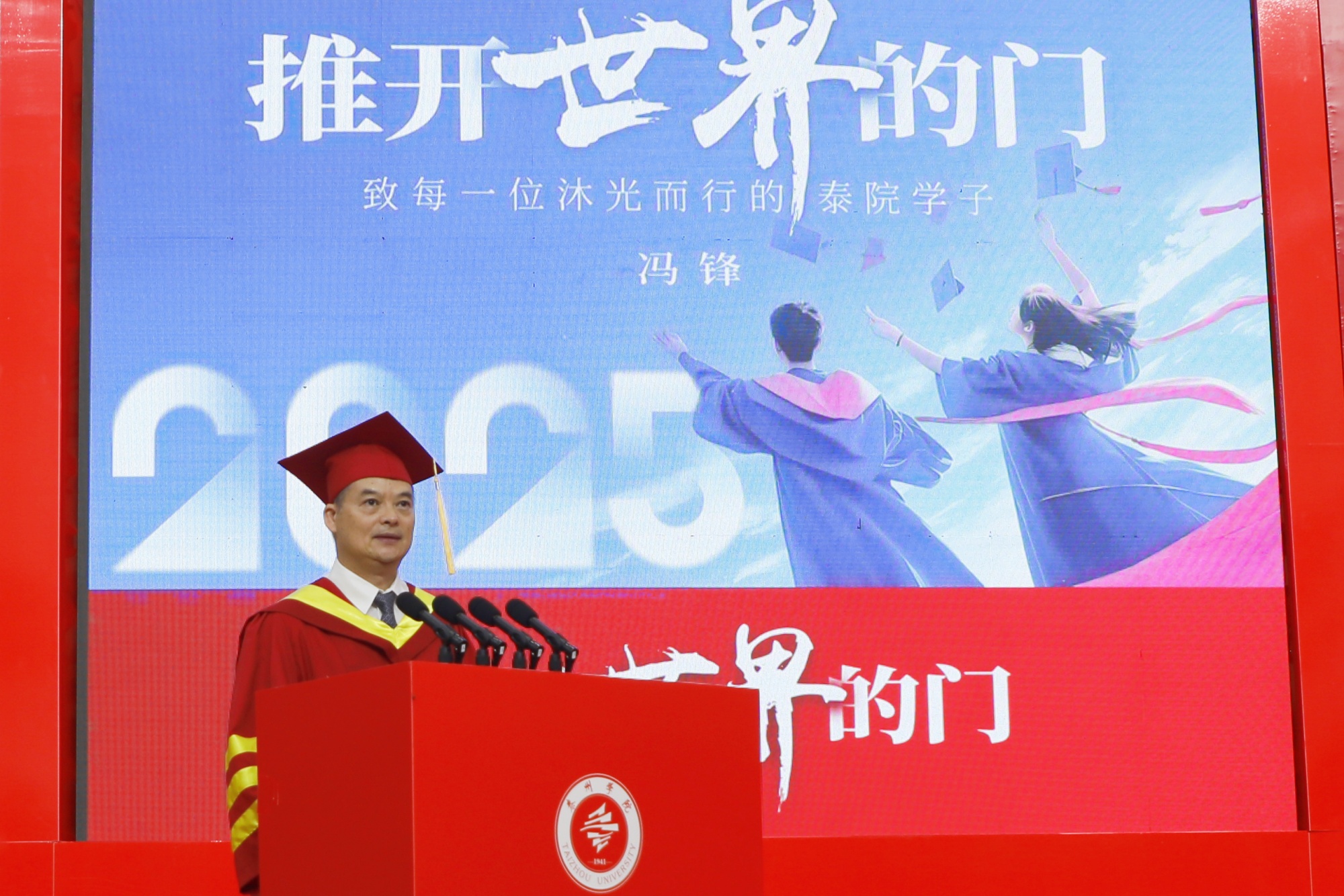 校党委副书记、校长冯锋发表题为《推开世界的门——致每一位沐光而行的泰院学子》的致辞。他深情回顾2025届毕业生从懵懂青涩的“追光者”成长为蓄势待发的“发光体”的成长历程,肯定同学们在泰院精神滋养下取得的丰硕成果,并勉励同学们以沐光而行的开放姿态,去看见更多的新世界,感受生命的辽阔;以沐光而行的坚实行动,去认知和影响外面的世界,展现生命的力量;以沐光而行的能量积累,去创造自己独有的世界,实现生命的价值。