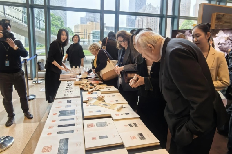 美国东部时间6月9日,值“文明对话国际日”庆祝之际,由浙江省人民政府新闻办公室、西泠印社策划的“文明互鉴·世界愿景”图形印展在美国纽约联合国总部大楼展出,中国常驻联合国代表傅聪大使,联合国副秘书长、文明联盟高级代表莫拉蒂诺斯以及部分国家常驻联合国代表或代办等中外嘉宾观展。
