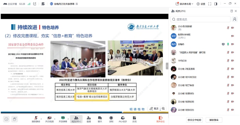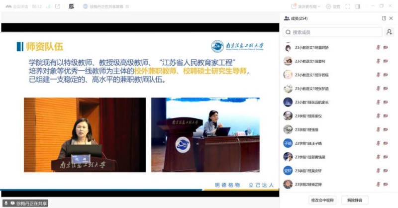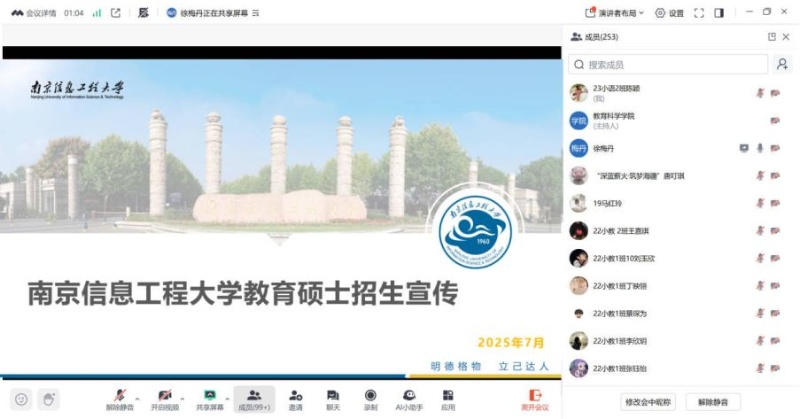宣传老师详细介绍了南京信息工程大学教师教育学院的特色优势、人才培养成效、学科建设、师资力量、科研成果、研究生就业等内容,并结合2025年学校的研究生招生政策,对招生规模及报名条件进行了详细解读,重点介绍了南京信息工程大学教师教育学院的科研团队,展示了学院在科研方面的优势和成果。