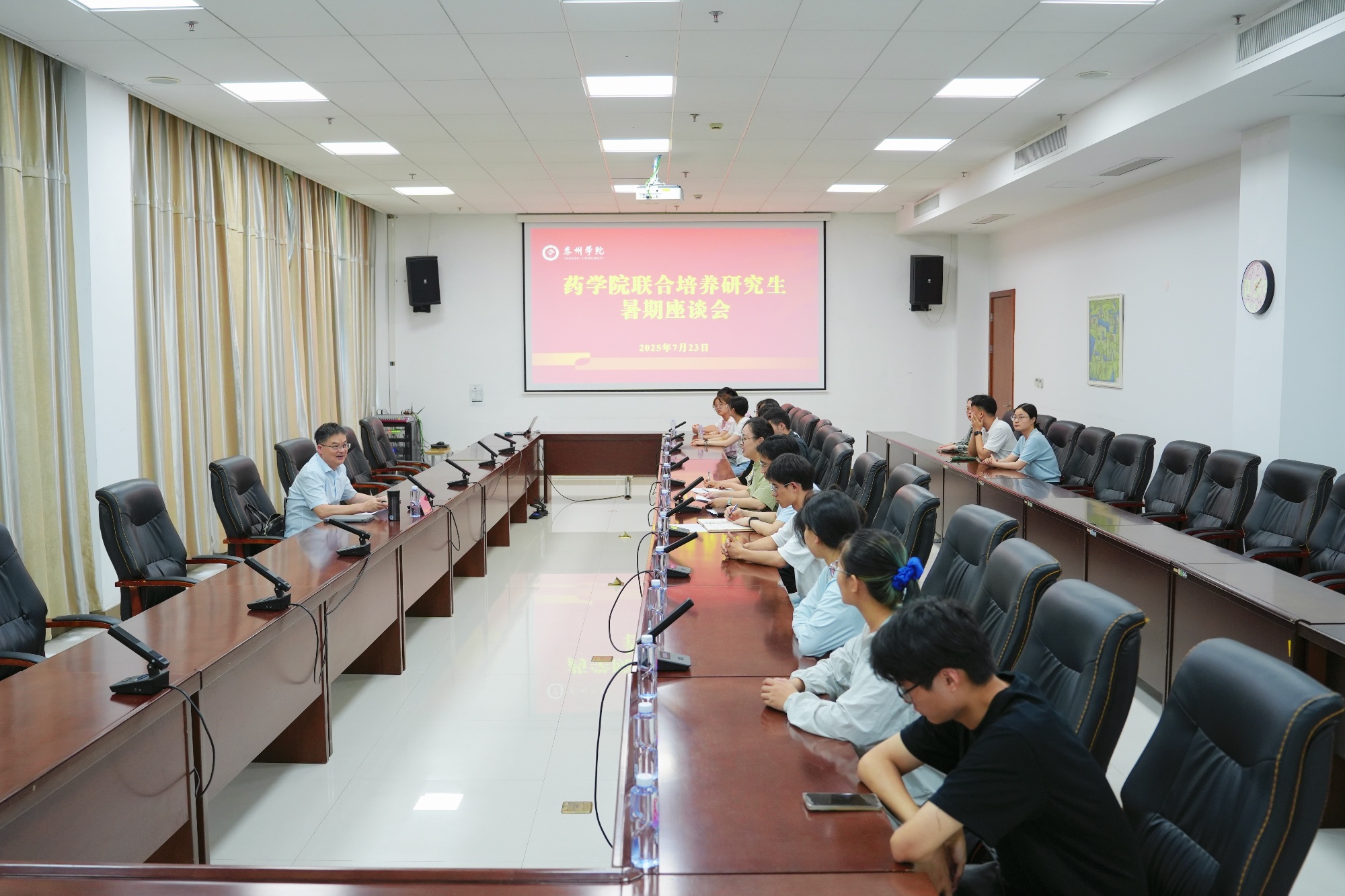 药学院负责人介绍了学院联合培养研究生的基本情况及暑期科研进展。同学们围绕学业进展、科研方向、在校生活等方面畅所欲言,导师们现场答疑解惑。