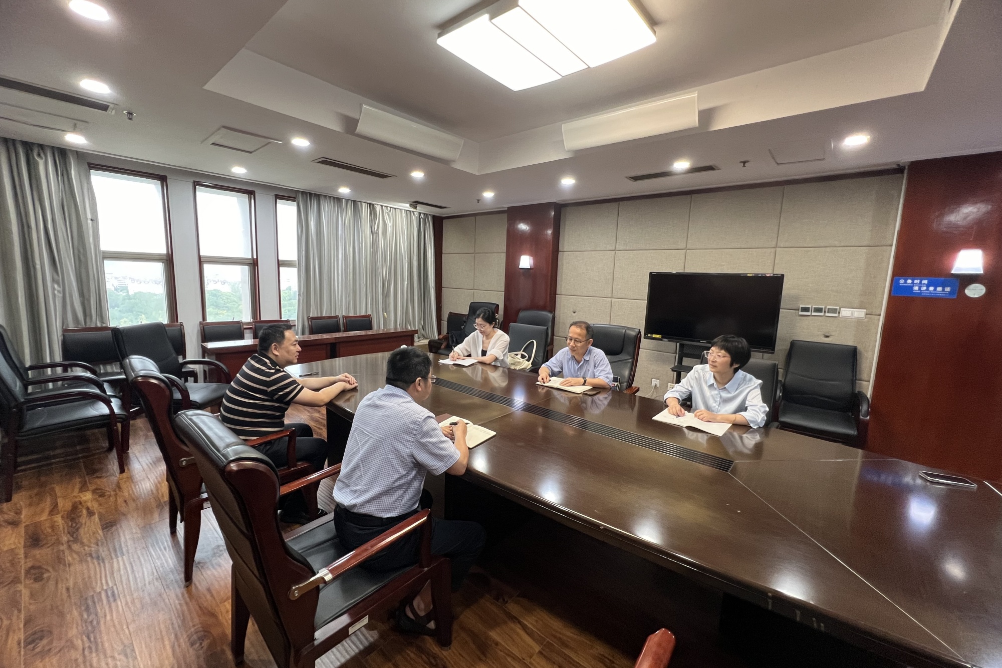 在泰州市统计局,副局长樊留国回顾了与数理学院合作的历程,在数据资源共享、学生实习实践、联合课题攻关等方面取得的成效。为进一步加深合作,他希望双方能够聚焦泰州市经济社会发展的战略需求和统计改革的前沿问题,在即将开展的人口普查调查和其他专项统计调查中,邀请学院师生更深入地参与方案设计、数据采集等环节,发挥高校智力优势。