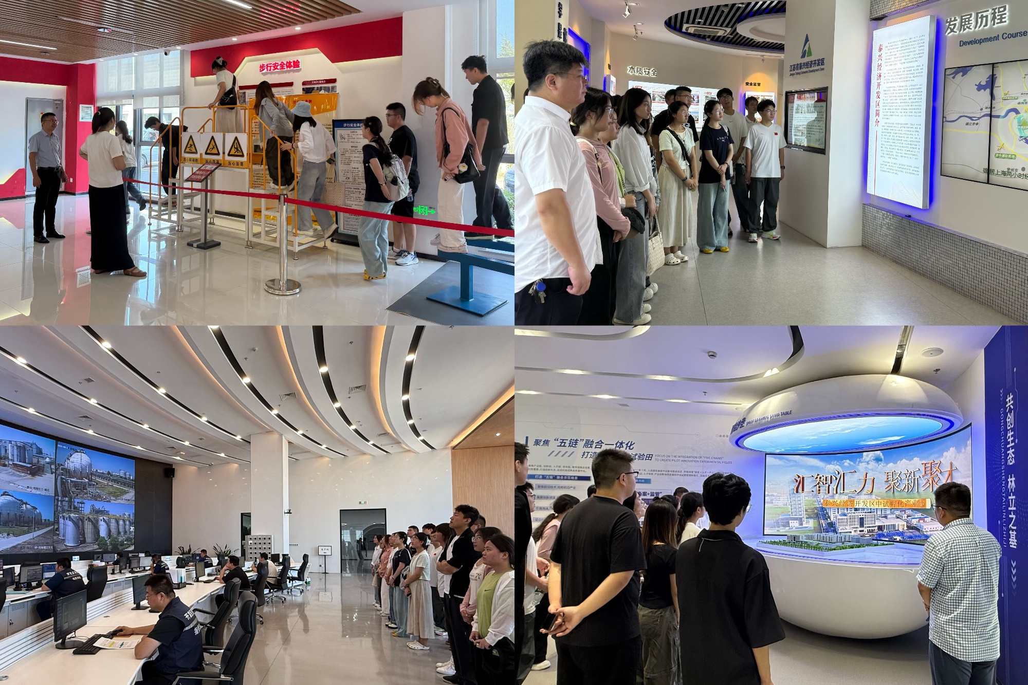 上午,实践团队依次走访了园区内的化工安全技能实训基地、规划展览馆、智慧园区指挥中心和中试孵化产业园。通过实地调研,团队成员深入了解了现代化工安全操作规范与应急处置流程,系统把握了开发区的产业布局与发展愿景,实时感知了“工业互联网+安全生产”的现代化治理模式,并近距离观摩科技创新成果转化流程,精准理解产业孵化的创新模式。
