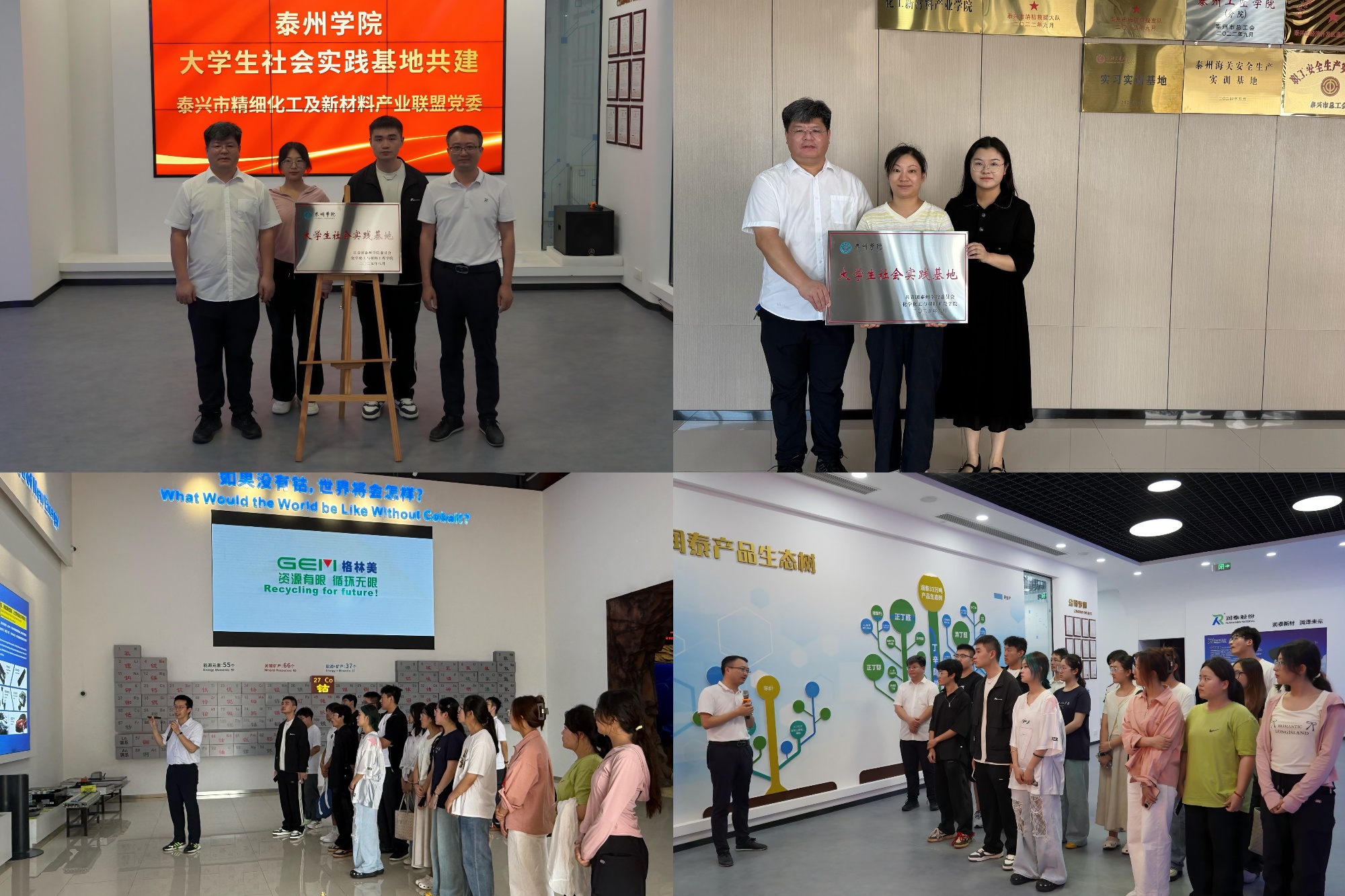 下午,团队先后走进格林美钴业股份有限公司和润泰化学有限公司两家园区代表性企业,全面认识了长三角化工产业集群布局与绿色转型路径,现场观摩了智能化生产控制与资源循环利用等先进实践,切身感受从实验室研发到产业化落地的全链条创新机制。活动期间,学院与泰兴市精细化工及新材料产业联盟党委、润泰化学有限公司结对共建“大学生社会实践基地”,为进一步推动产学研协同创新和人才培养奠定坚实基础。