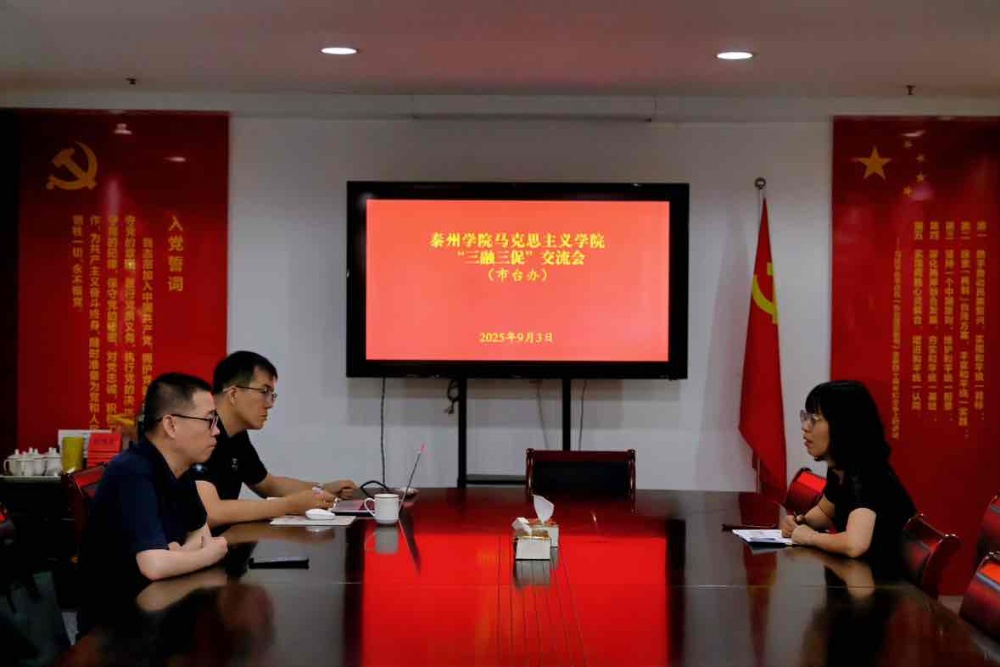 为深入推进“三融三促”校城共兴计划,9月3日,马克思主义学院院长刁龙带领“三融三促”服务团代表一行赴泰州市台办开展调研交流。此次交流聚焦涉台教育和思政课建设,旨在探索校地合作新路径,服务新时代对台宣传教育工作。