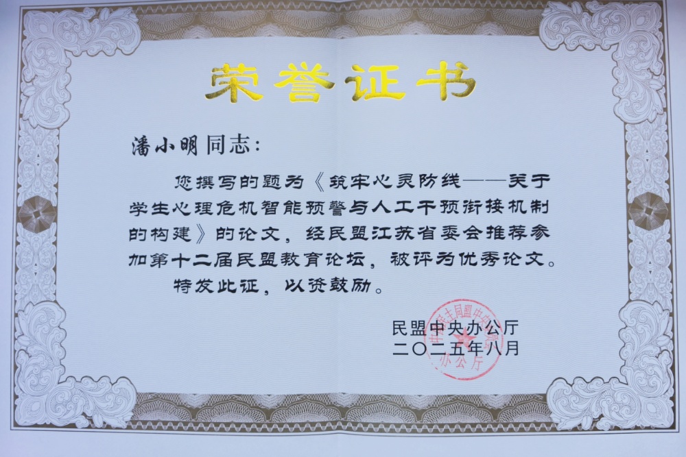 此次论坛共收到30个省级民盟组织以及民盟中央教育委员会、青年委员会推荐提交的论文194篇,经过专家评审、民盟中央核审,最终评选出优秀论文52篇。米兰官网民盟支部盟员、LETOU国际米兰官网院长潘小明教授撰写的《筑牢心灵防线——关于学生心理危机智能预警与人工干预衔接机制的构建》获评优秀论文。