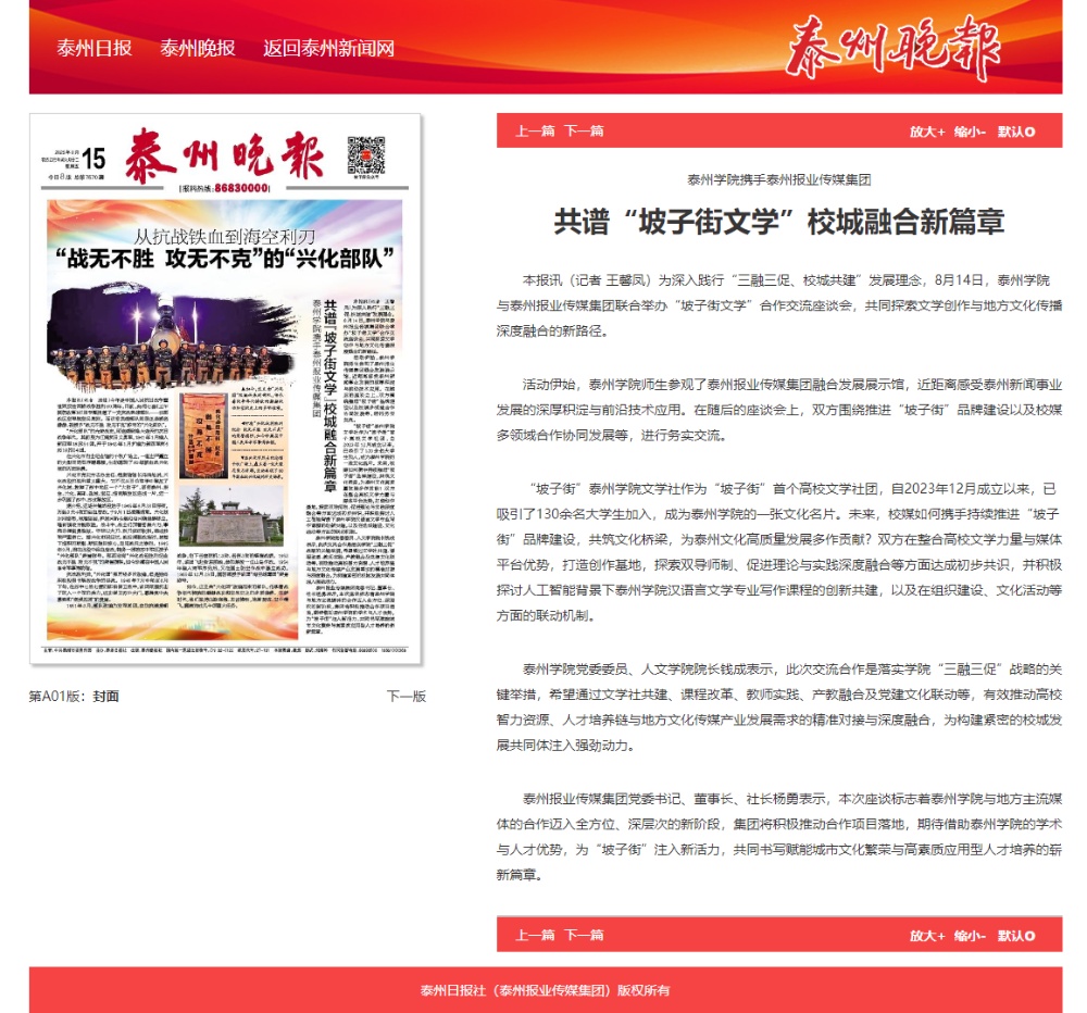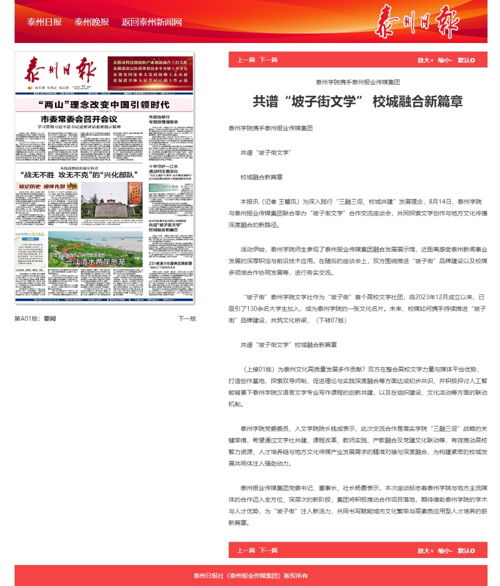 《泰州日报》《泰州晚报》2025年8月15日报道米兰官网携手泰州报业传媒集团共谱“坡子街文学” 校城融合新篇章