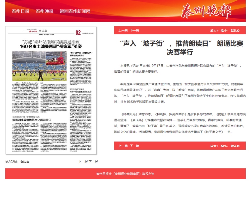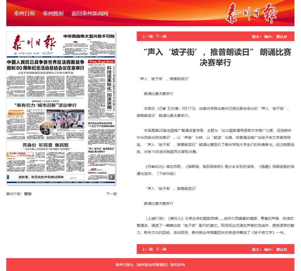 《泰州日报》《泰州晚报》2025年9月18日报道《“声入‘坡子街’,推普朗读日” 朗诵比赛决赛举行》