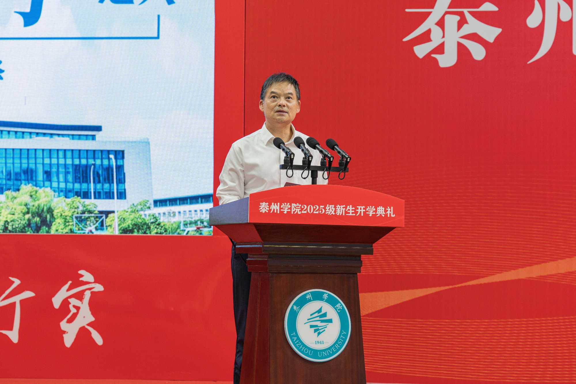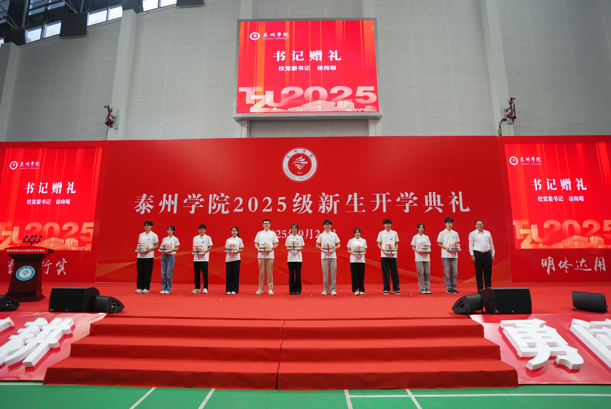 典礼在学校星光合唱团气势磅礴的大合唱《保卫黄河》中拉开帷幕。校党委书记徐向明教授为新生代表送上学校精心准备的“启程行囊”礼包,他期待全体新生珍惜泰院缘,牢记家国情,多读书、多实践,弘扬“扎根、深耕、勇闯、善创”的泰院精神,涵养“光明、多彩、温暖、活力”的阳光特质,和学校共成长、同进步。定制版《阳光学子成长笔记》是记录大学点滴、见证自我蜕变的“时光手册”;印有泰院标识的“同心”衫象征着新生自此融入泰院大家庭,与学校同心同行;《万古江河》与《人类简史》丛书旨在引导新生拓宽认知边界,在历史与文明的脉络中汲取成长力量;“我与泰院的第一张合影”定格下初入校园的珍贵瞬间,成为与学校情感联结的起点;实用的成长手袋陪伴新生装下书本与梦想。