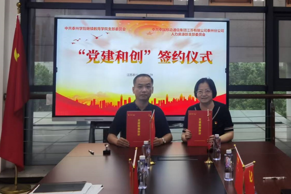 继续教育学院党支部书记高建宁与泰州移动公司人力资源部党支部书记夏安洵共同签署了《党建和创协议》,标志着双方在构建“资源共享、优势互补、互相促进、共同提高”的党建工作新格局上迈出了坚实的一步。
