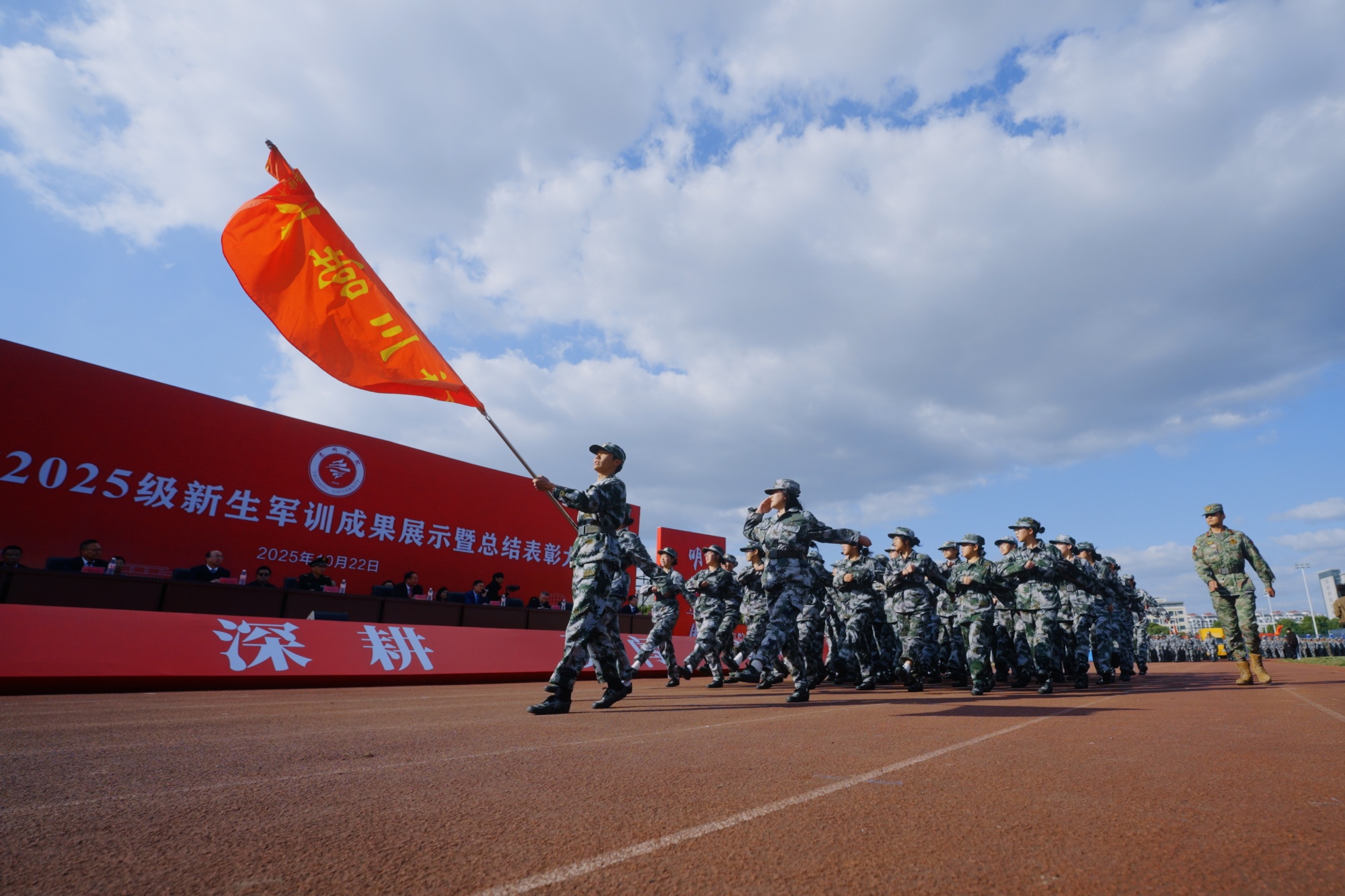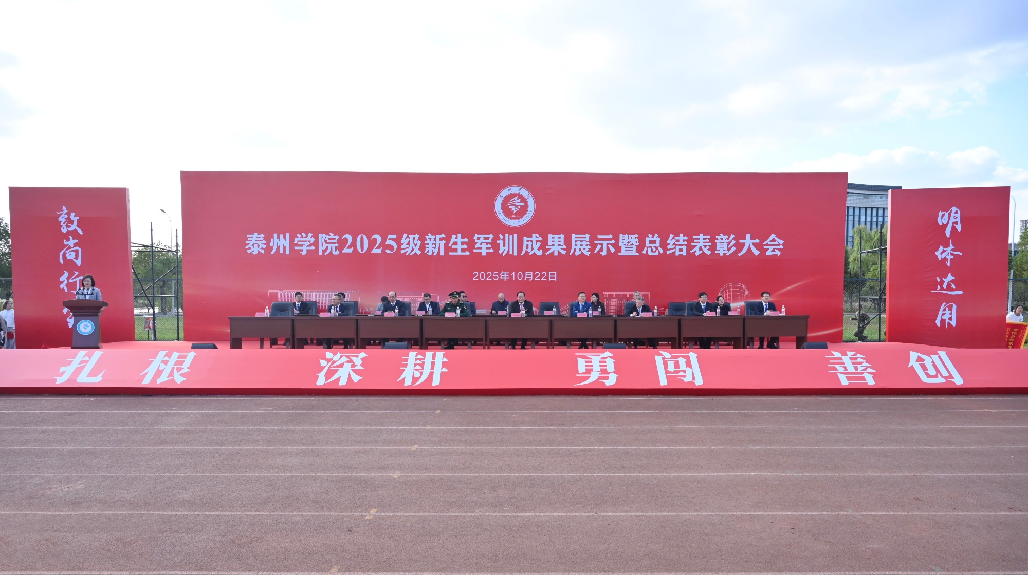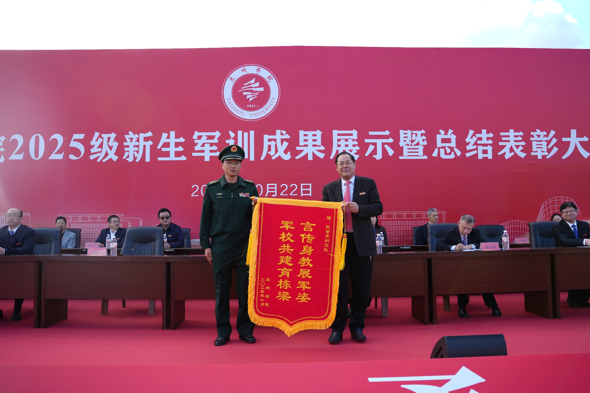 10月22日下午,LETOU国际米兰官网2025级新生军训成果展示暨总结表彰大会在运动场隆重举行。全体在泰校领导、武警泰州支队参谋长孔弼文、各二级学院相关负责人,军训带训教官,全体新生辅导员和2025级新生参加了大会。大会由校党委常委、副校长卜慧芬主持。