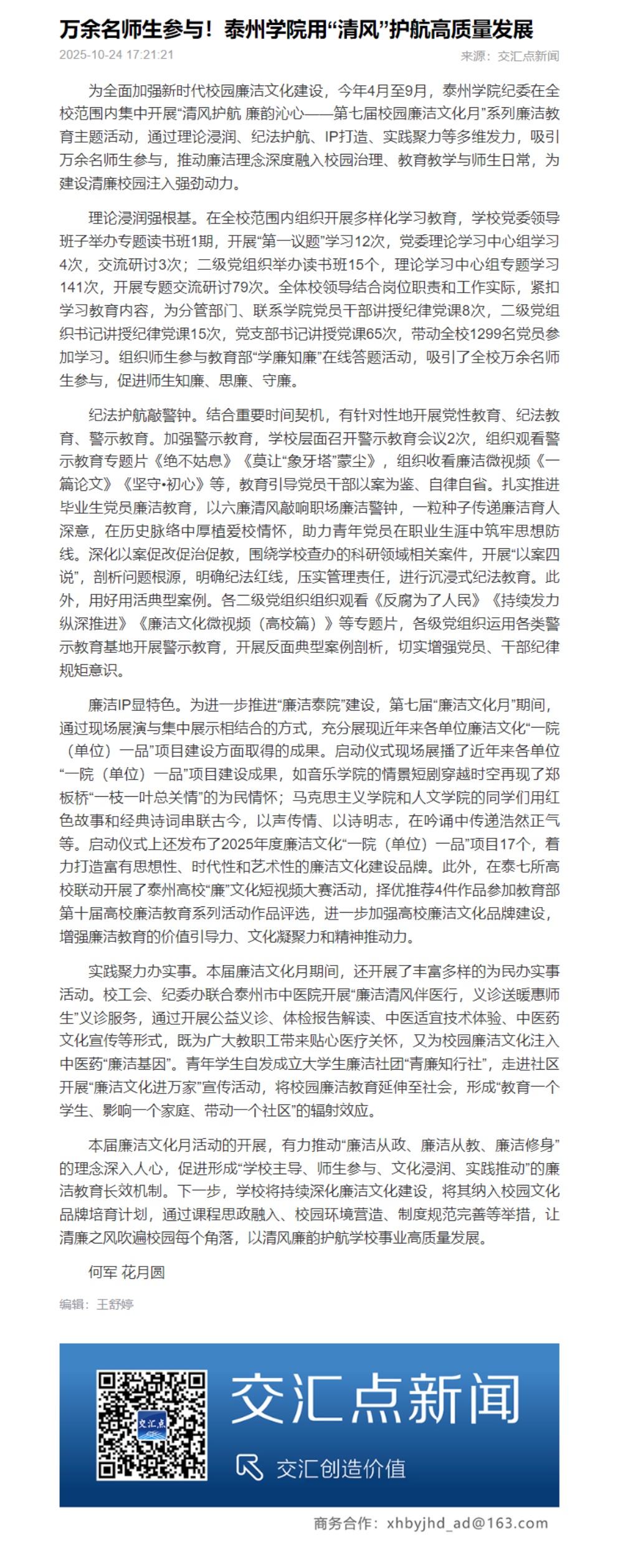 《交汇点新闻》2025年10月24日报道《万余名师生参与!LETOU国际米兰官网用“清风”护航高质量发展》