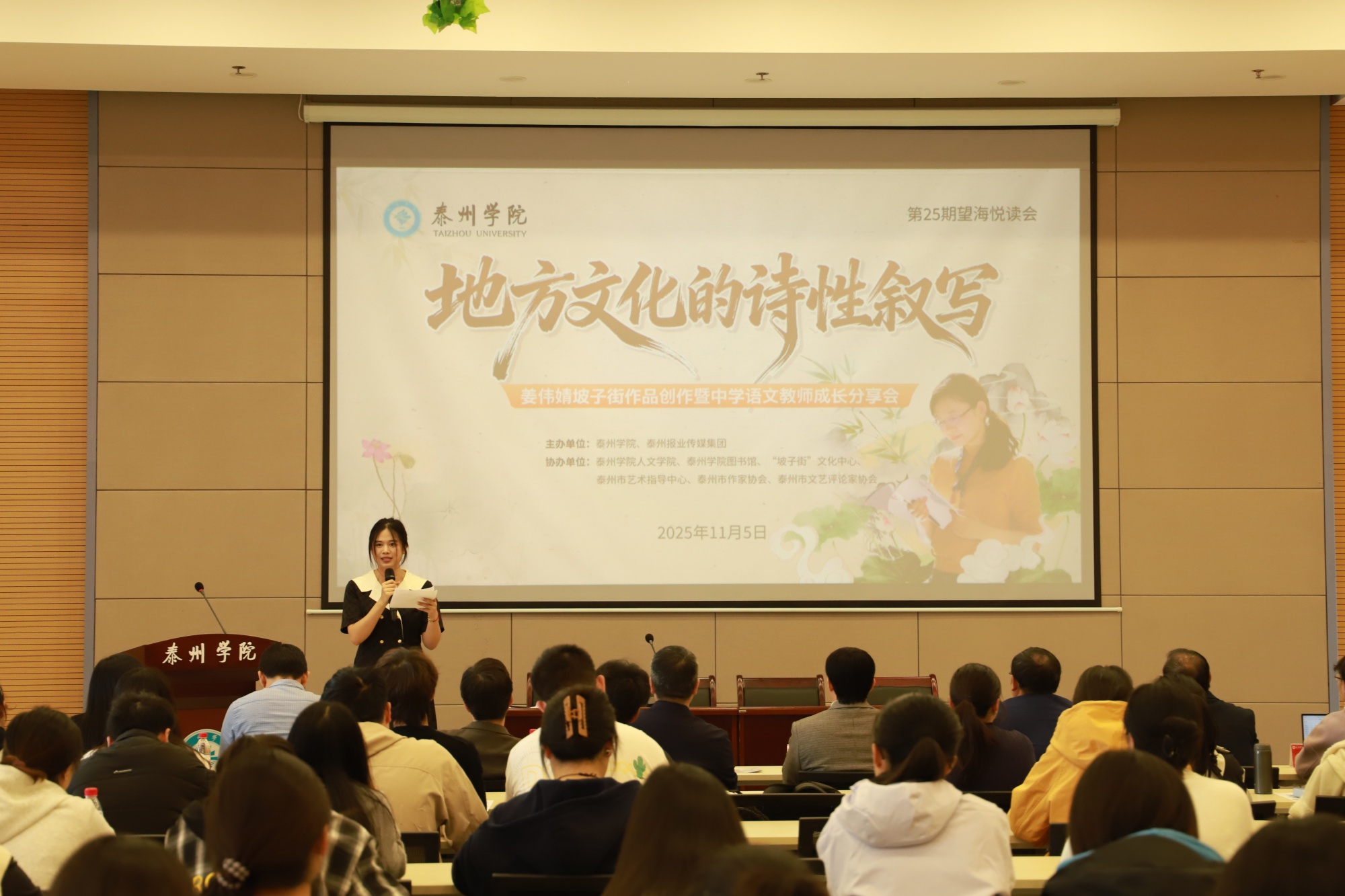 11月5日下午,“地方文化的诗性叙写——姜伟婧坡子街作品创作暨中学语文教师成长分享会”在米兰官网图书馆胡瑗讲堂举行。此次活动由米兰官网与泰州报业传媒集团联合主办,人文学院、校图书馆、“坡子街”文化中心、泰州市艺术指导中心等共同承办,旨在搭建文学创作与教学实践交流平台,传承弘扬地方文化,共话中学语文教师成长,赋能师范生职业发展。泰州报业传媒集团党委委员、副社长苏元华,泰州市文联艺术指导中心主任周卫彬,“坡子街”文化中心编辑部主任李明官、运营部副主任仲金城,泰州市田家炳实验中学语文教师姜伟婧,校图书馆馆长李中明,人文学院院长钱成以及师生代表等共140人参加活动。