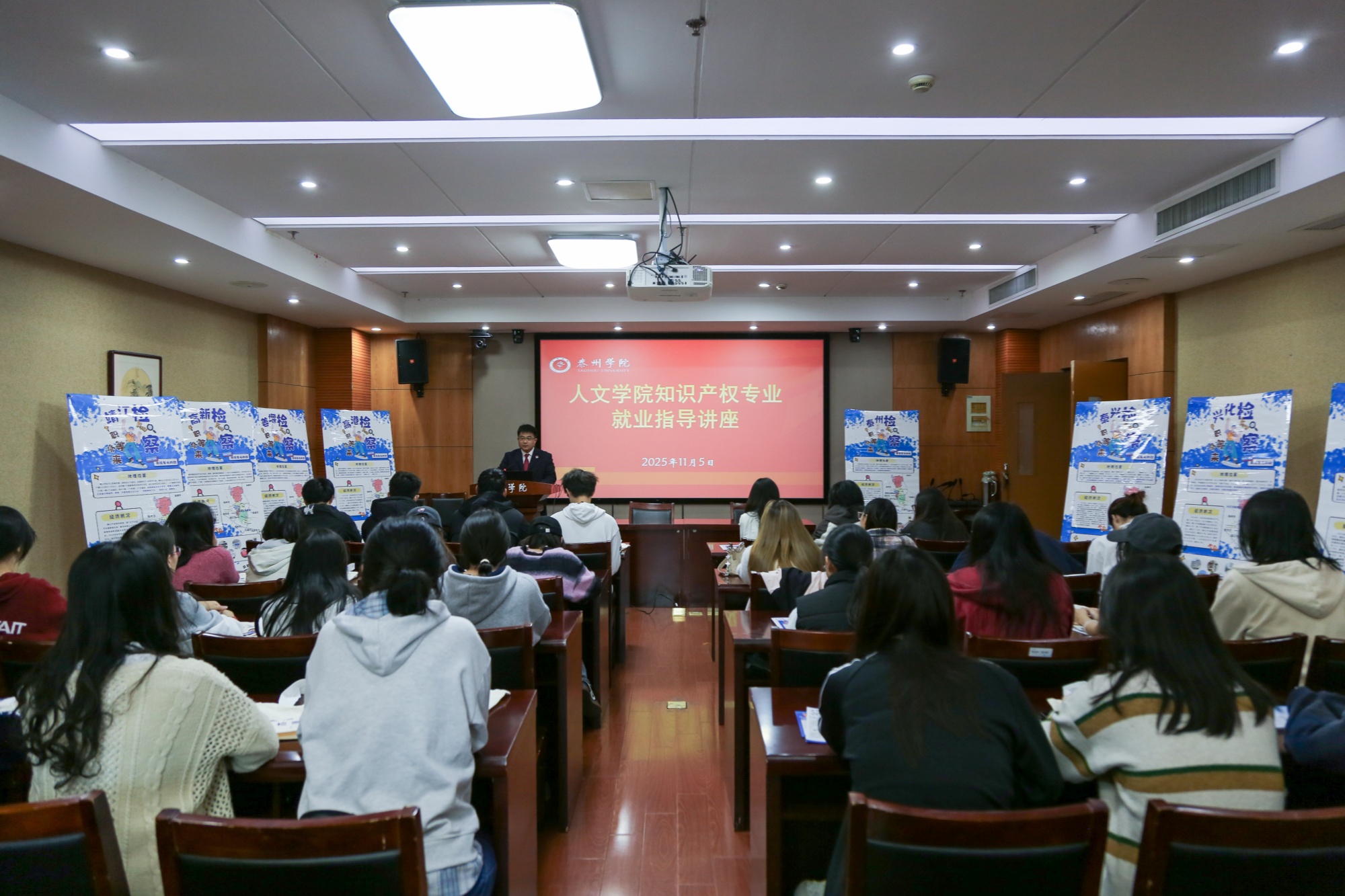 11月5日下午,应人文学院邀请,泰州市高港区检察院、海陵区检察院的检察官们走进米兰官网,举办法治护航就业讲座,为2026届知识产权专业同学报考检察院公务员提供精准指导。
